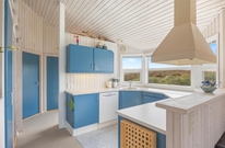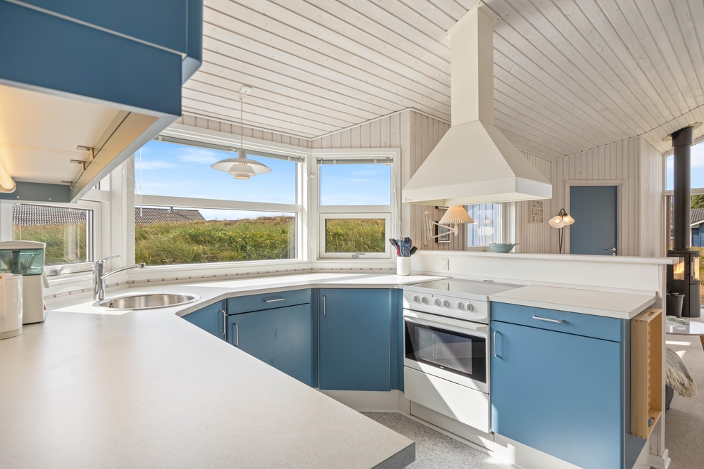 Das Zentrum dieses typisch skandinavischen Ferienhauses im Bjerregårdsvej 308 bildet der offene Wohnbereich mit seiner großzügigen Fensterfront, den hellen Holzdecken und Wänden und gemütlichen Sitzmöbeln. Macht es euch mit eurem Lieblingsbuch in einem der Sessel bequem, genießt die Aussicht in die malerische Natur und lauscht dabei dem Knistern des Kaminfeuers. Hier könnt ihr den Alltagsstress hinter euch lassen und die Seele baumeln lassen.