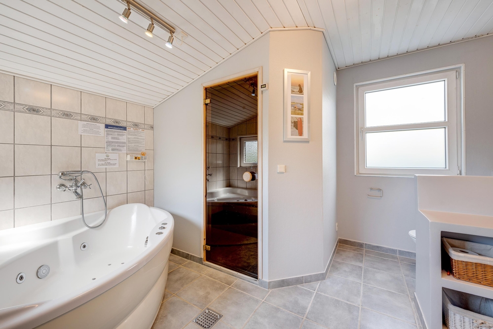 Das geräumige Badezimmer verfügt sowohl über eine Sauna als auch über einen Whirlpool, hier könnt Ihr euch nach einem langen Spaziergang in der Natur entspannen. Macht Ihr euch Kerzen an, öffnet Ihr eine Flasche Wein, macht Ihr es euch gemütlich und vergesst Ihr den Alltagsstress.