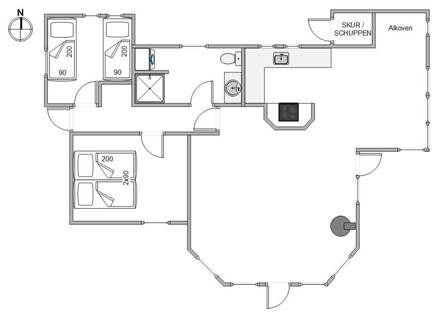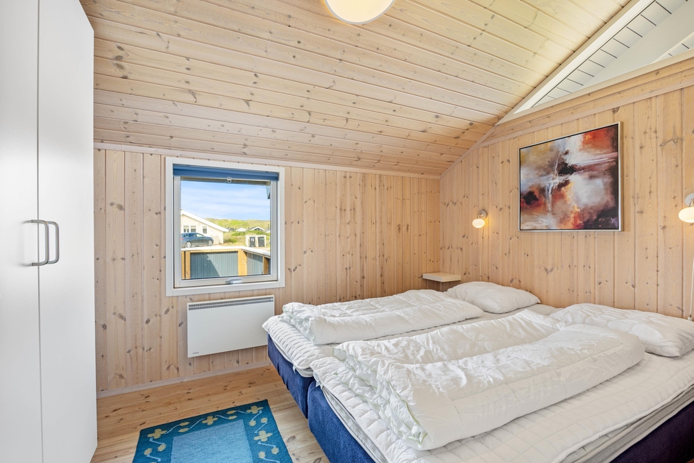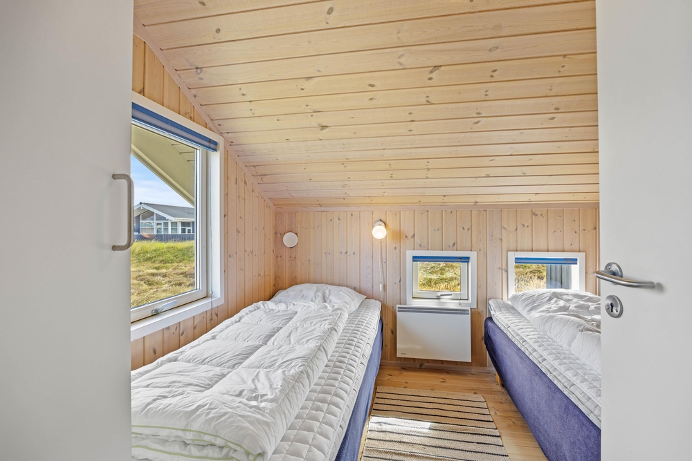 Das schöne Holzdekor ist hell angestrichen, sodass das Ferienhaus angenehm hell ist. Durch die großen Fenster im Wohnbereich habt ihr nicht nur einen tollen Blick auf die Dünen- und Heidelandschaft, sondern könnt euch über viel Licht im Sommer und im Winter freuen. Du kannst dich zwischen zwei gemütlichen Schlafzimmern entscheiden.