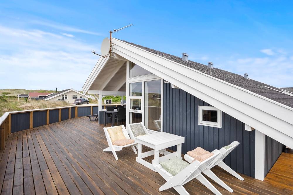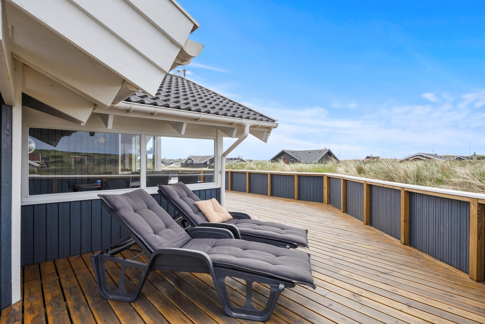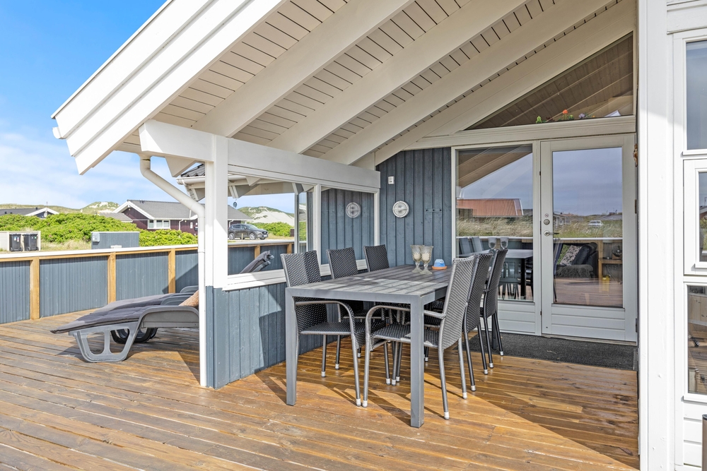 Vom Wohnzimmer aus gelangt ihr auf die Terrasse, die sowohl windgeschützt und überdacht ist. Sollte es dann doch mal im Urlaub regnen oder stürmen, müsst ihr also nicht komplett auf das Draußen sitzen verzichten. Wenn aber die Sonne scheint, kannst du dich mit deinem neuen Buch und einer Tasse Kaffee auf die freie und offene Fläche der Terrasse setzen, um die Sonne zu genießen. Da die Terrasse fast ganz um das Ferienhaus geht, findet jeder einen tollen Platz.