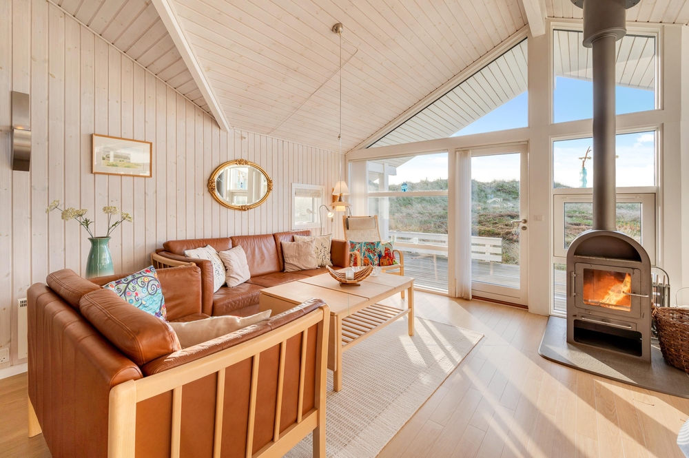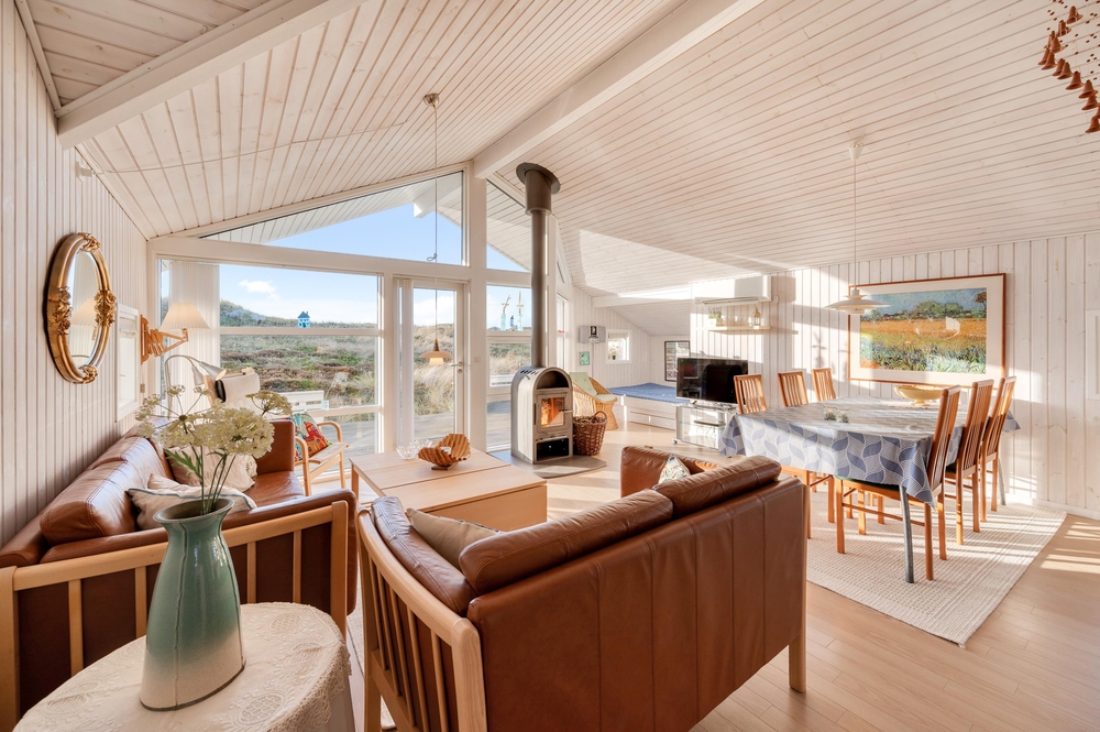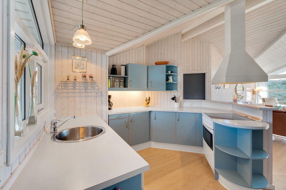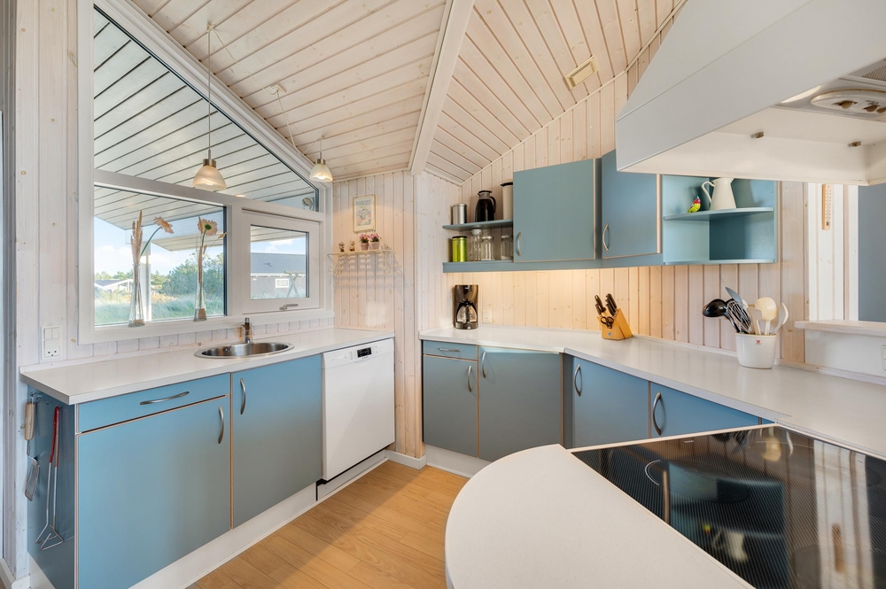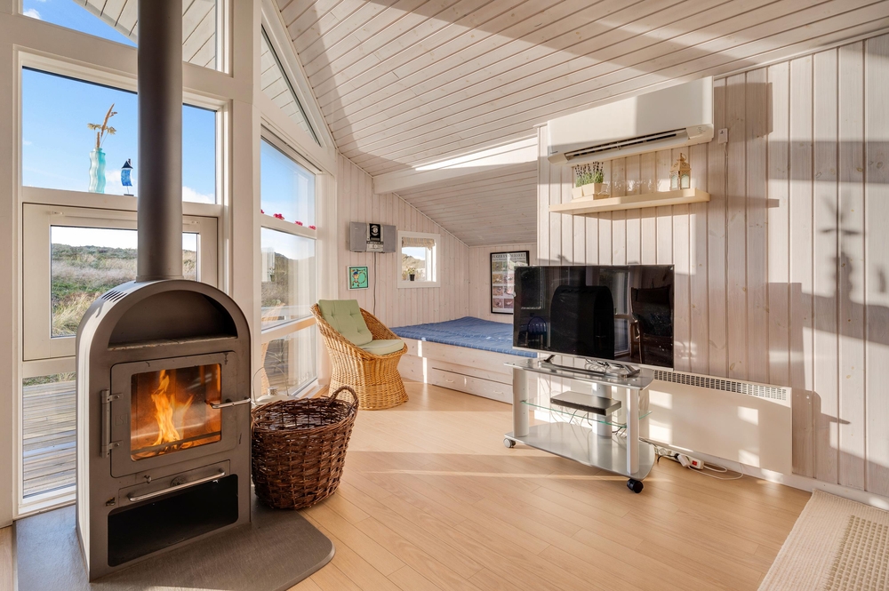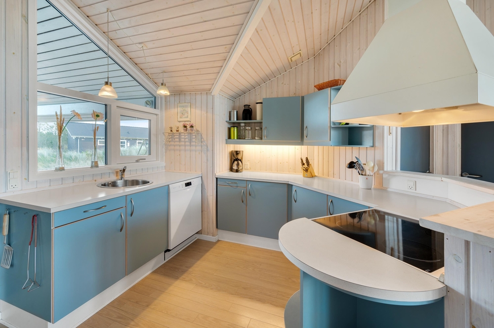 Die Küche und der Wohnbereich hat hohe Decken, die Küche ist mit Geschirrspüler, Mikrowelle und einem 10 Liter Gefrierfach ausgestattet. Das Wohnzimmer wurde gemütlich eingerichtet, verfügt über einen Holzboden und eine schöne Aussicht über die Dünenlandschaft nach Westen.