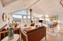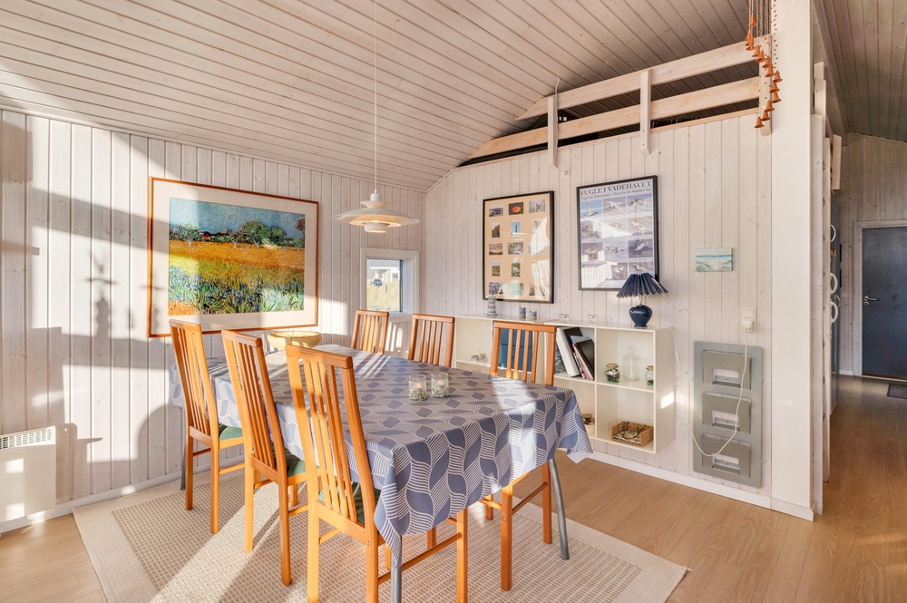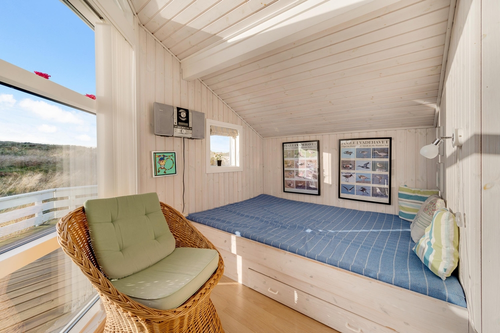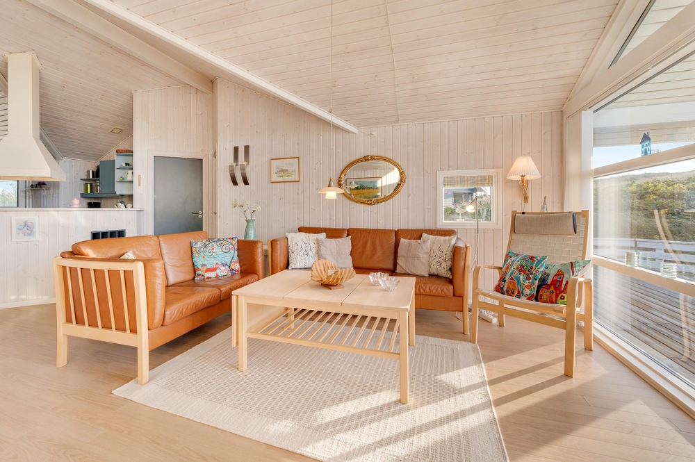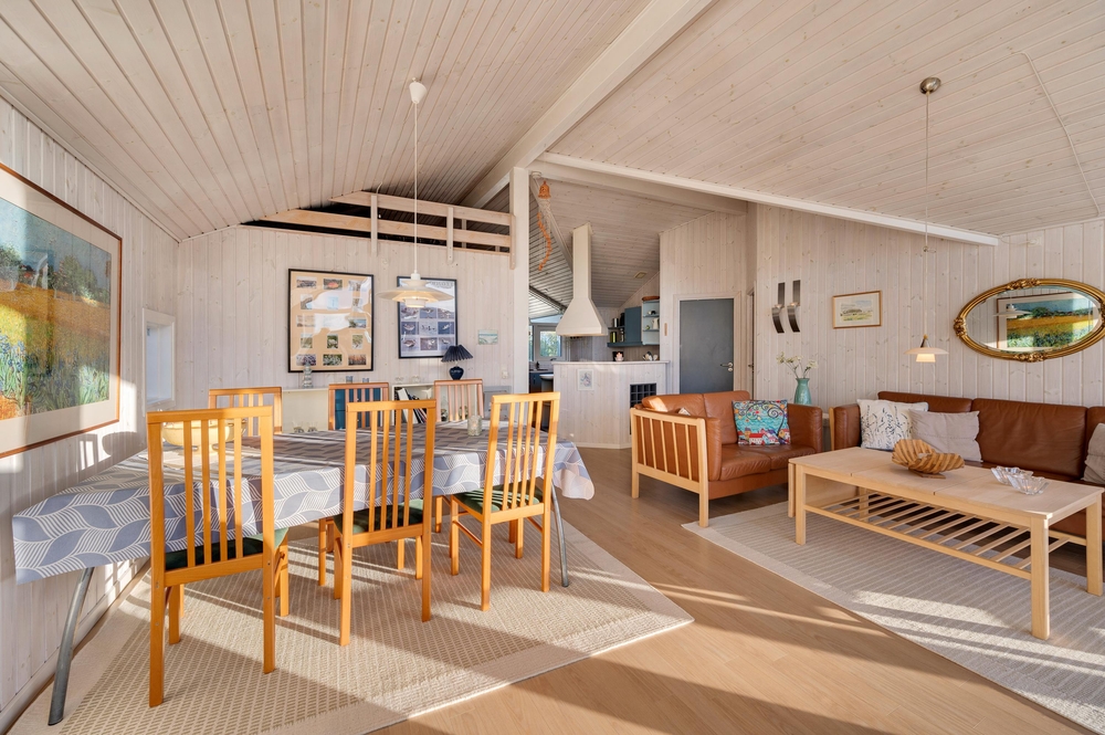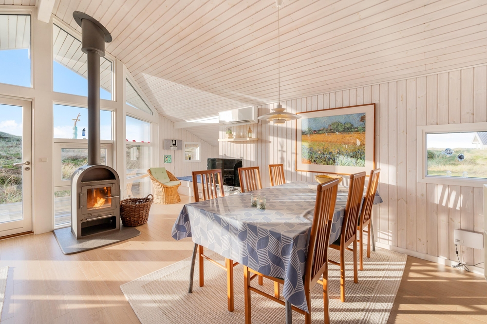 Die Küche und der Wohnbereich hat hohe Decken, die Küche ist mit Geschirrspüler, Mikrowelle und einem 10 Liter Gefrierfach ausgestattet. Das Wohnzimmer wurde gemütlich eingerichtet, verfügt über einen Holzboden und eine schöne Aussicht über die Dünenlandschaft nach Westen.
