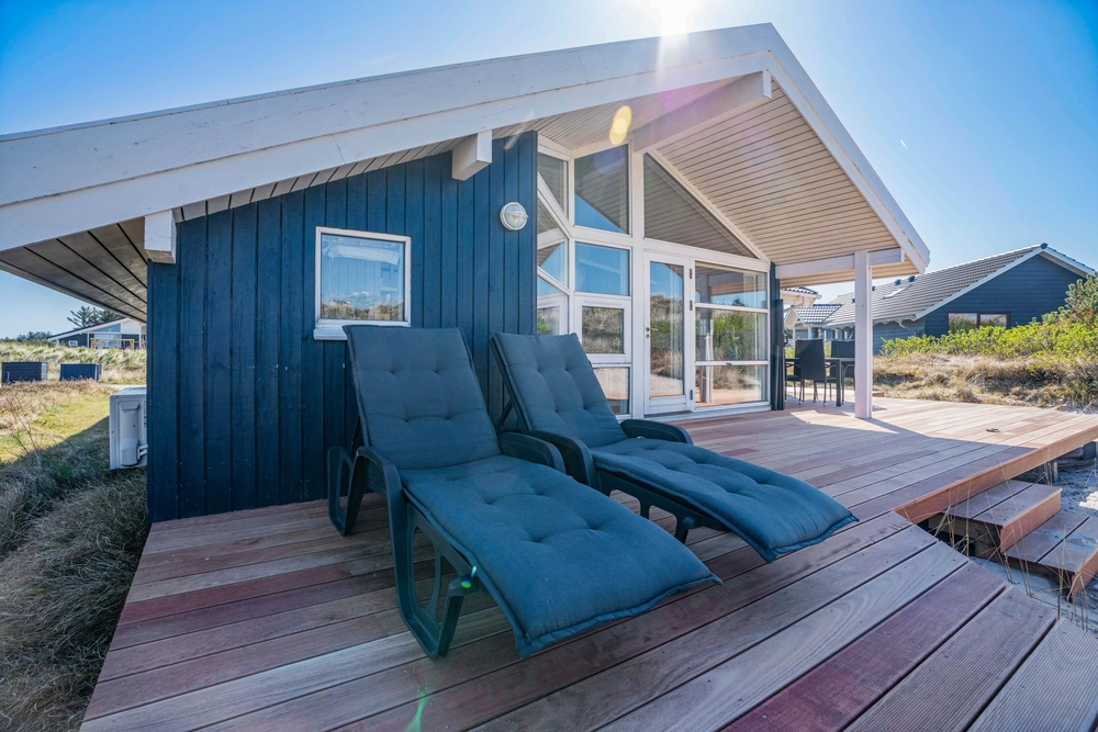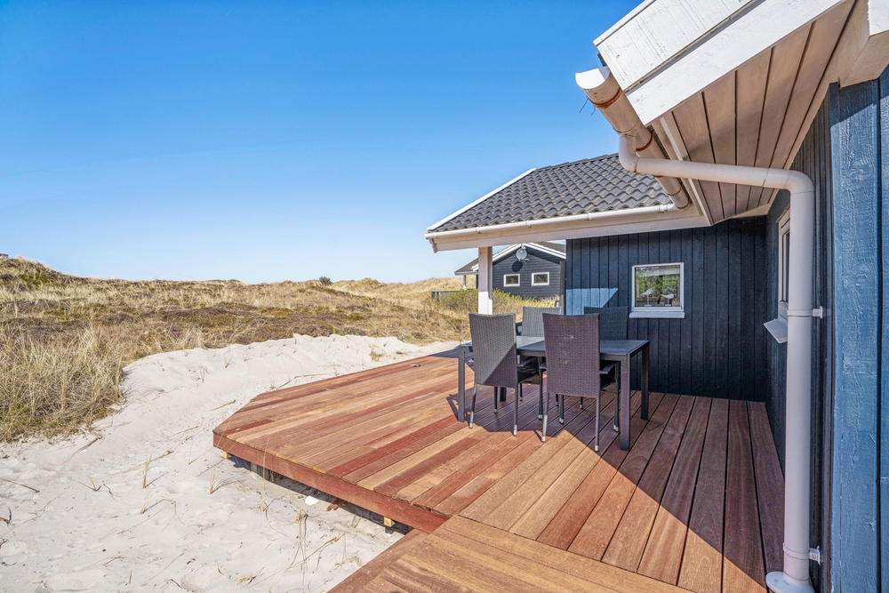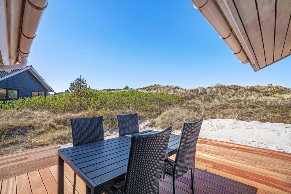 Die westliche Terrasse ist ebenfalls teilweise überdacht ? und abgeschirmt. Von hier habt Ihr einen tolle Blick auf die Dünenlandschaft. Die Nordsee liegt nur 750 Meter vom Haus entfernt.