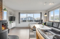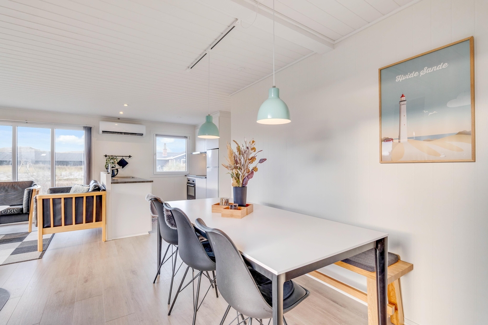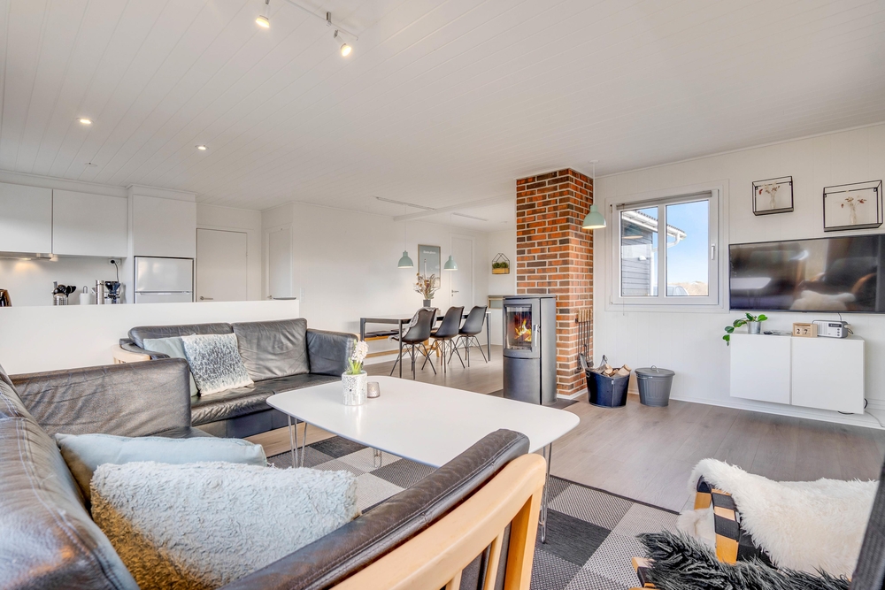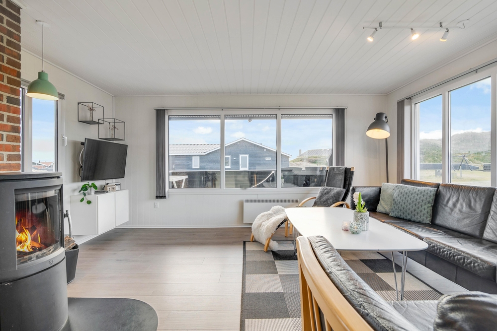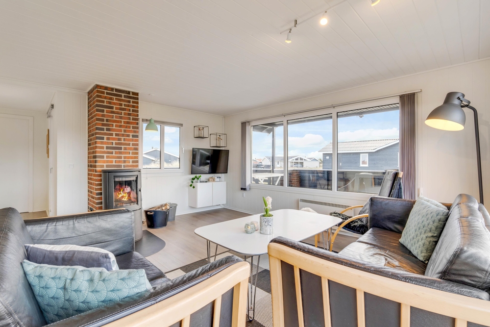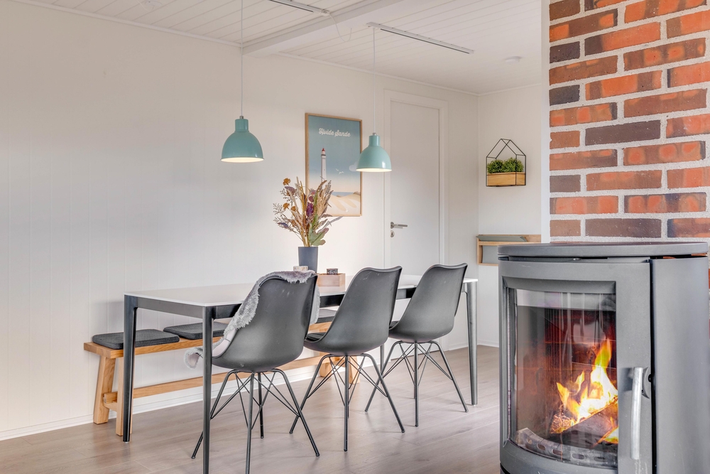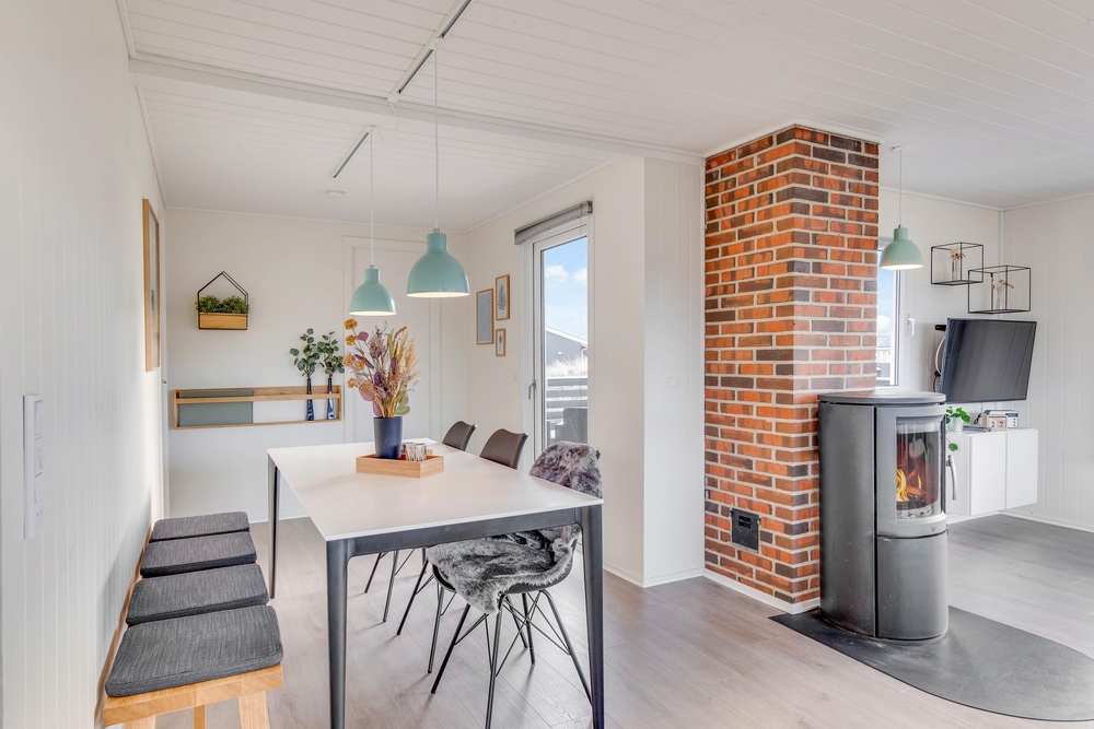Dank der zahlreichen Fenster fühlt man sich im Wohnbereich schon fast wie in einem Wintergarten,das natürliche Licht lässt den Raum hell und freundlich wirken. Die Einrichtung im typisch skandinavischen Stil trägt zu einer angenehmen Raumatmosphäre bei. Hier könnt ihr am knisternden Kaminfeuer sitzen und einen Film schauen oder am Esstisch einen Spieleabend verbringen.