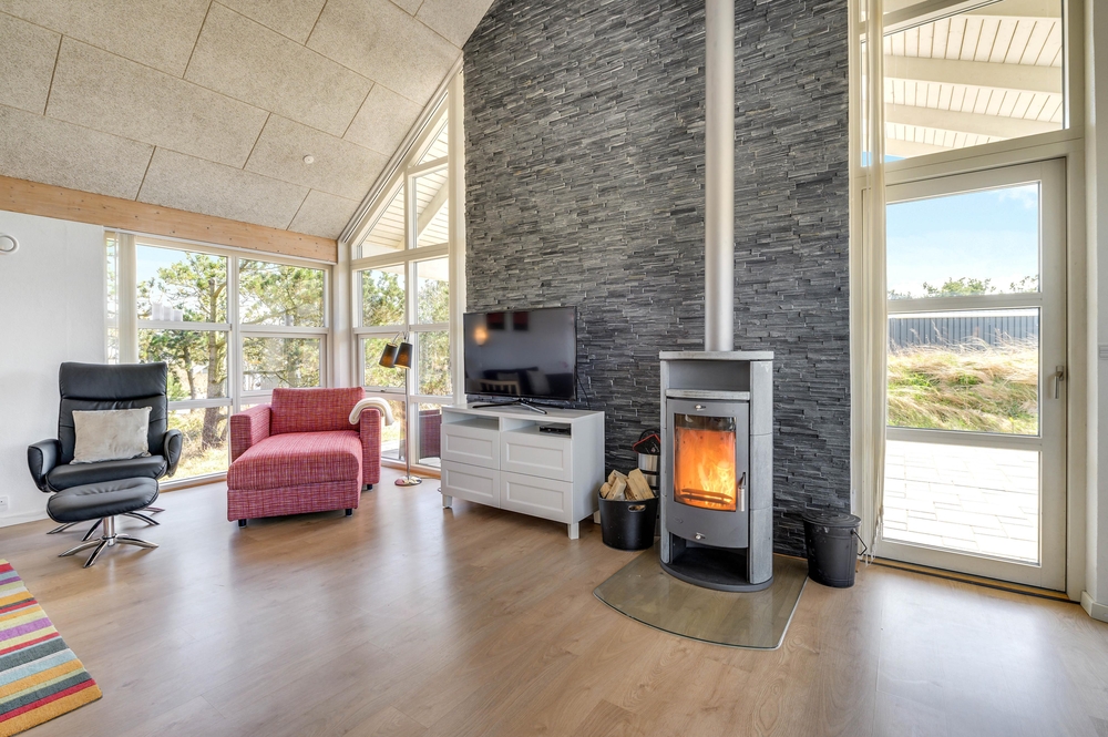 Die Küche ist offen mit dem Wohnzimmer verbunden, in dem der Kaminofen für wohlige Wärme und Entspannung sorgt. In dem Wohnzimmer gibt es auch bequeme Möbel und einen großen Flachbild-Fernseher.