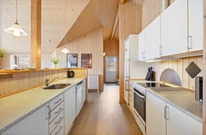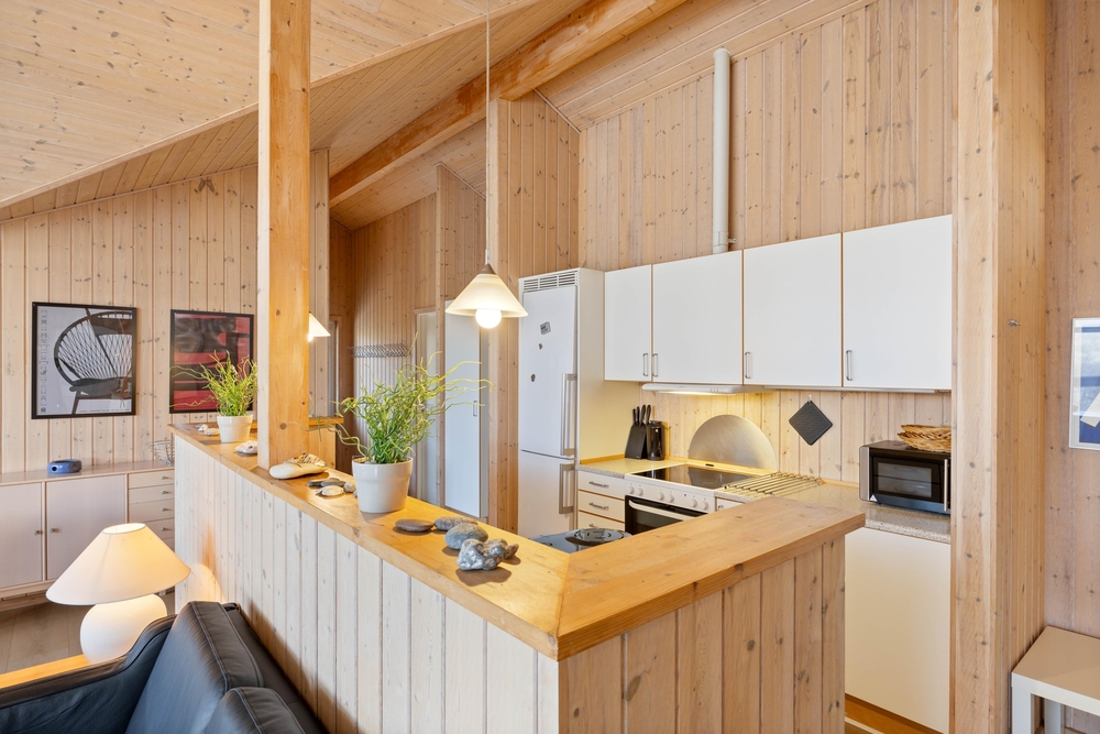 In der praktisch eingerichteten Küche sind ein Kühlschrank mit Gefrierfach, ein Glaskeramik-Kochfeld, Geschirrspüler und Mikrowellenherd vorhanden. Die Küche ist offen mit dem großen hellen Wohnzimmer kombiniert, das mit hübschen komfortablen Möbeln, Kaminofen und Holzfußboden ausgestattet ist.