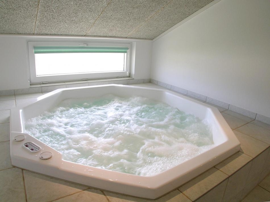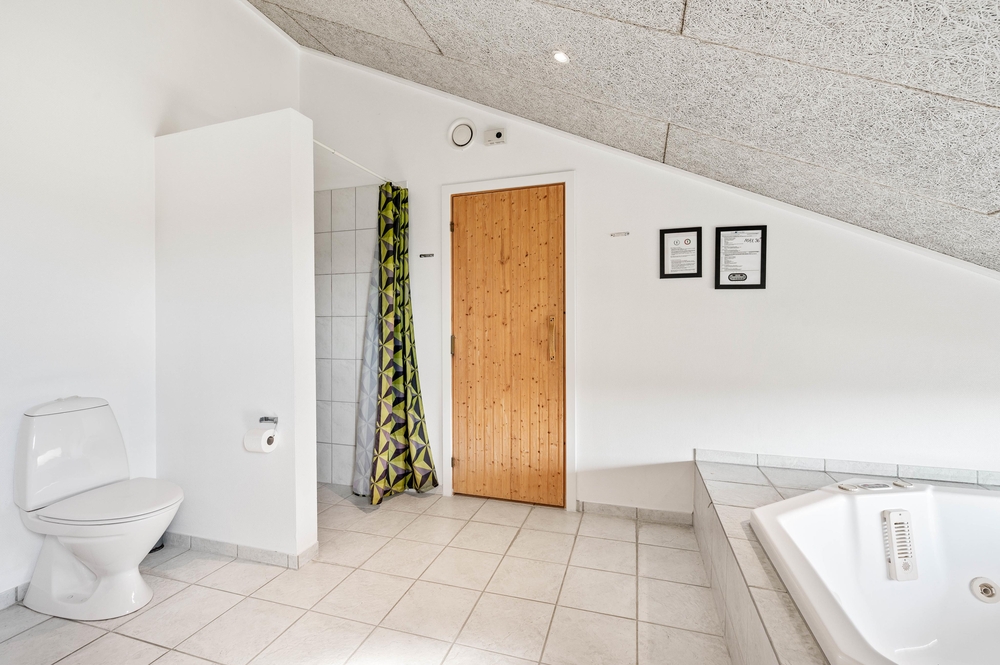 Außerdem hat das Ferienhaus zwei herrliche Badezimmer mit Fußbodenheizung und Duschen. In einem Badezimmer befinden sich zusätzlich ein Dauerwellnessbad für 6 Personen und eine Sauna.
