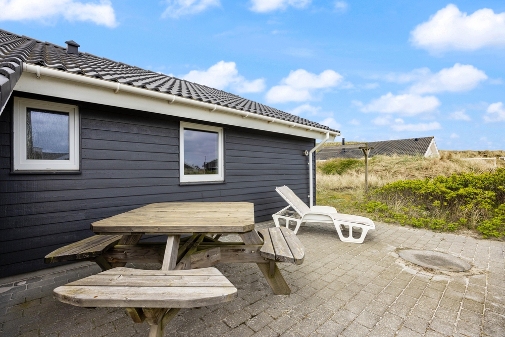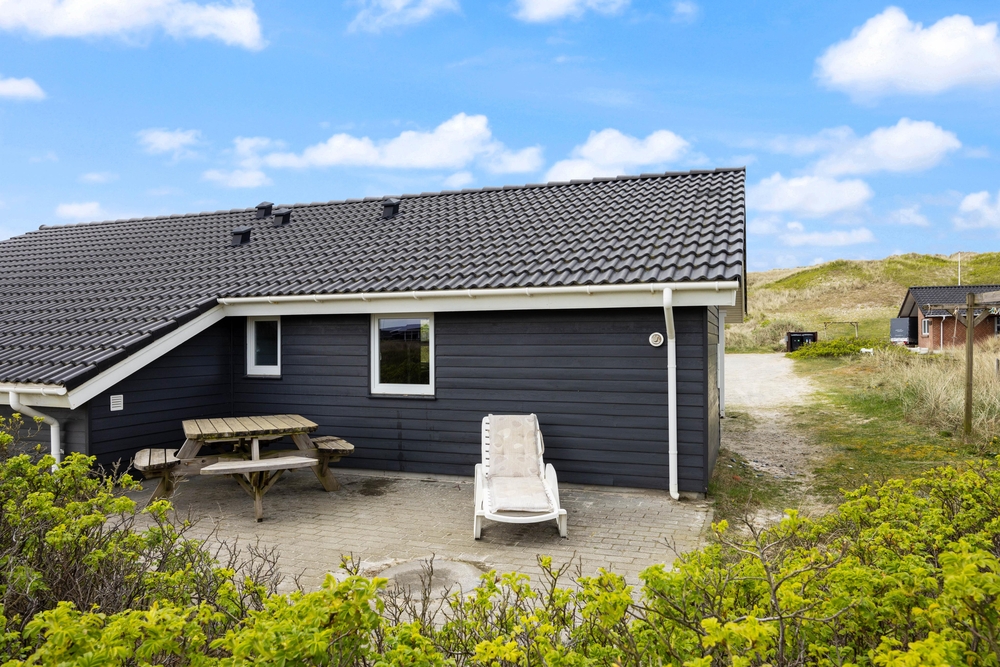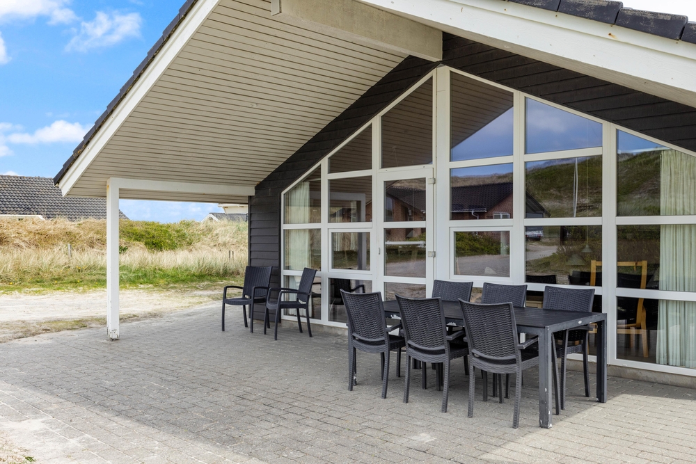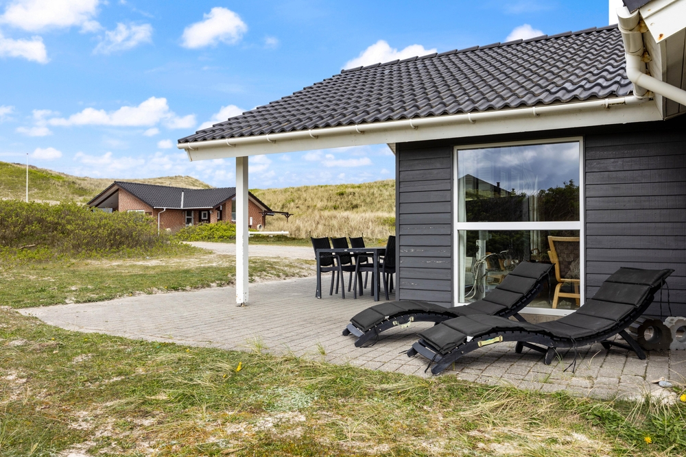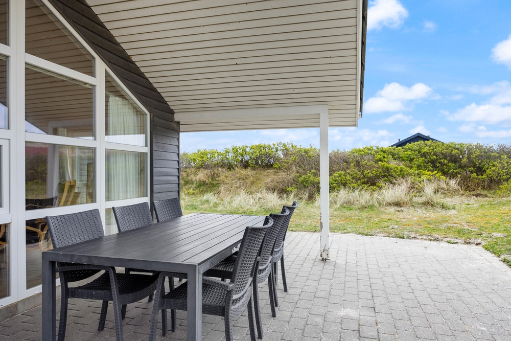 Von der großen und teilweise überdachten Terrasse könnt ihr die Aussicht auf die Dünen genießen. Das Ferienhaus ist auf natürliche Weise abgeschirmt, so dass ihr vor neugierigen Blicken geschützt seid.