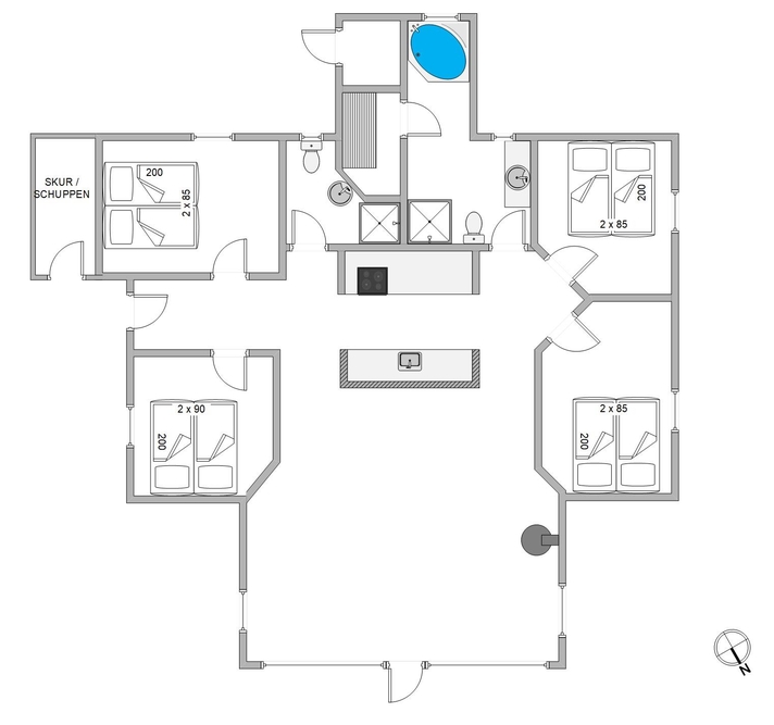 Euer Ferienhaus ist groß und einladend gestaltet, mit sehr viel Licht, das durch die große Fensterfront und die firsthohe Decke im Wohnzimmer hereinkommt. Es bietet Platz für 8 Personen. Alle vier Schlafzimmer haben Holzfußboden und sind mit besonders hohen Federkernmatratzen ausgestattet.