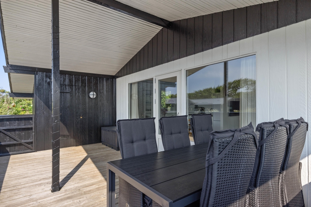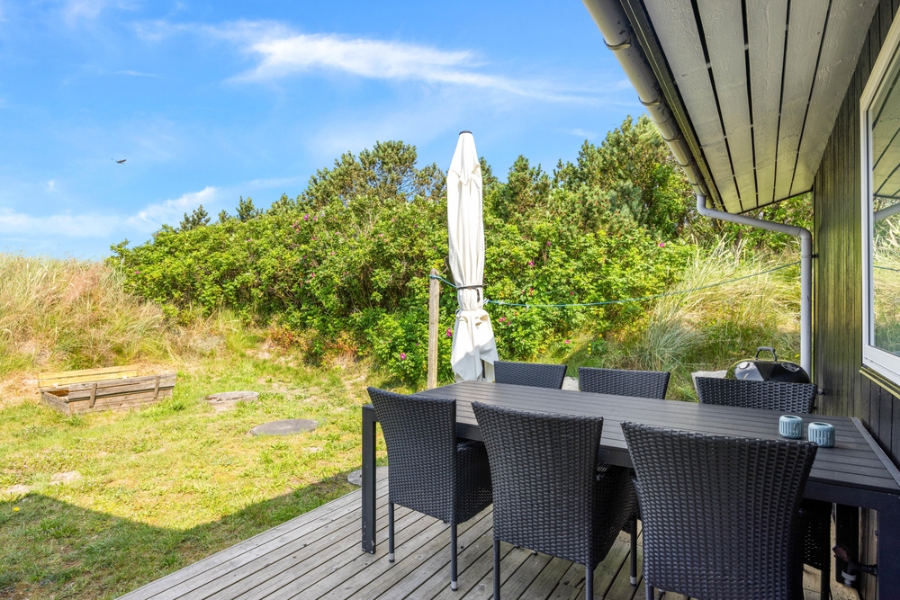 Die Terrasse ist teilweise überdacht und geschlossen, sodass ihr auch bei schlechterem Wetter die frische Luft genießen könnt. Für die kleinen Gäste gibt es einen Sandkasten, der für Unterhaltung sorgt. Der Außenbereich des Ferienhauses bietet somit für jeden etwas und verspricht erholsame Tage an der frischen Luft.