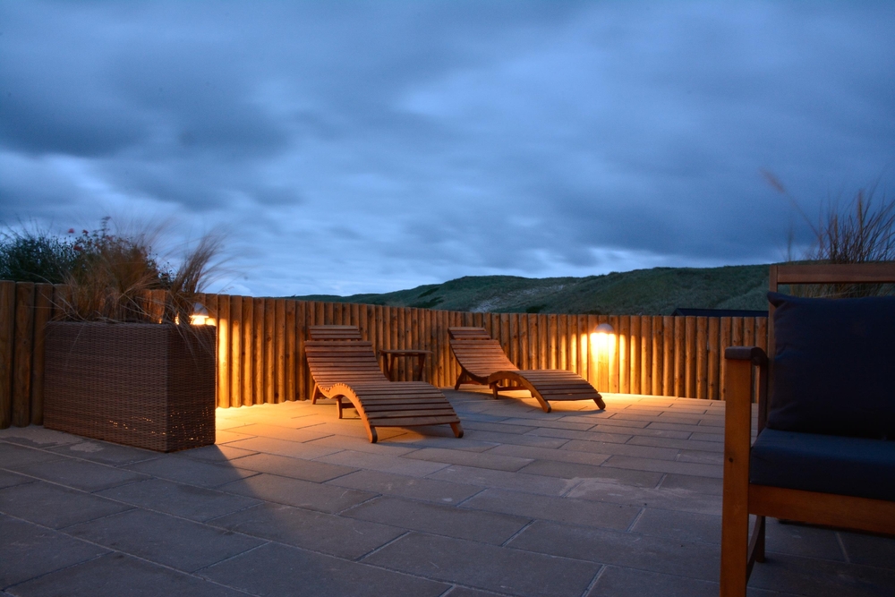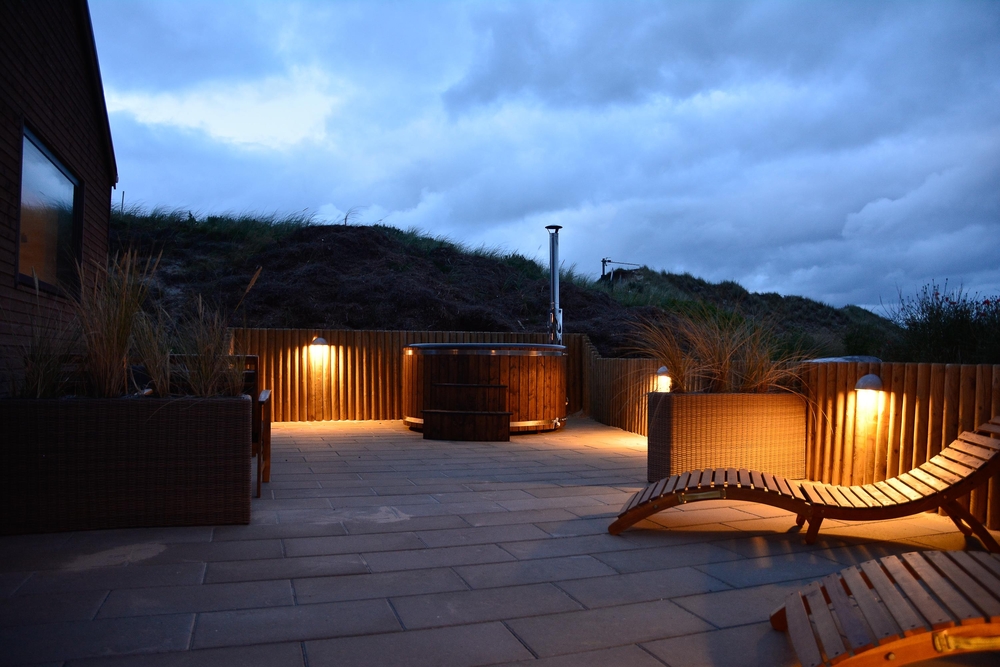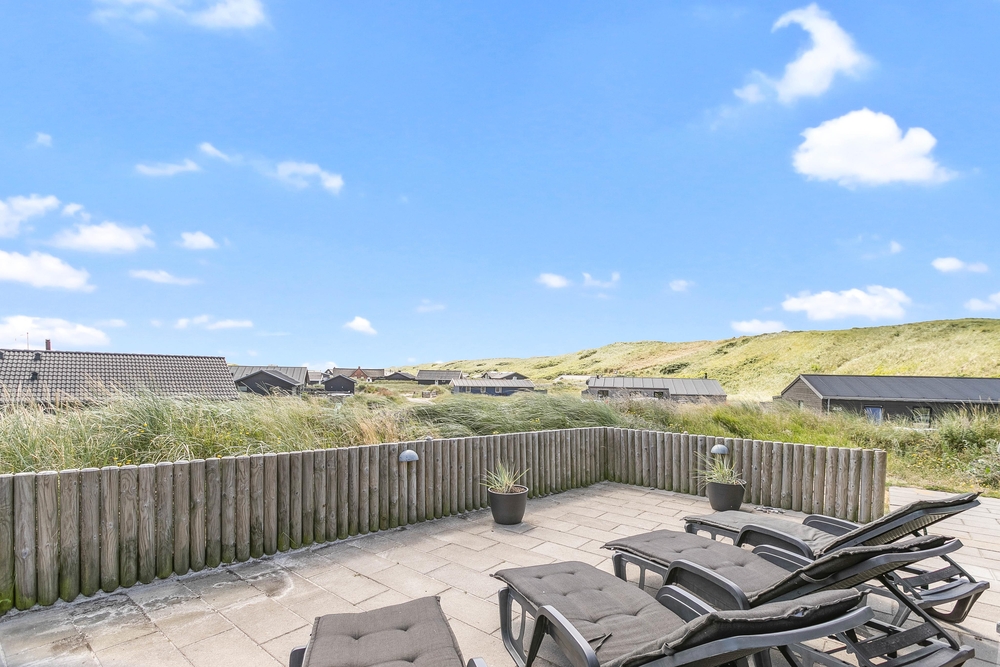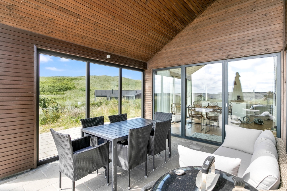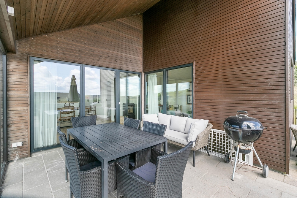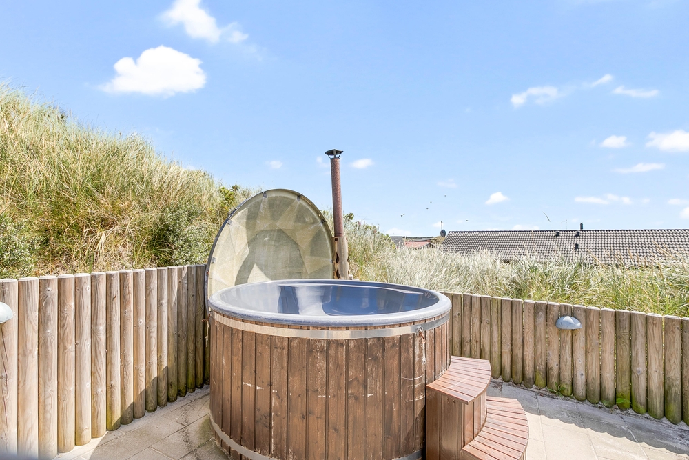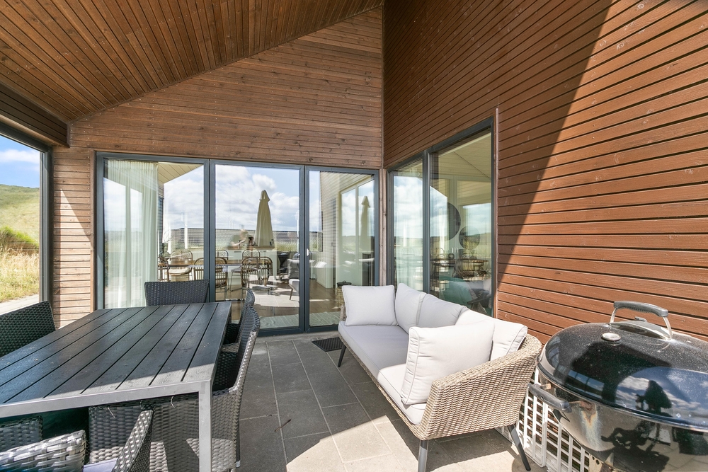 Die Terrasse ist ein Erlebnis für sich ? Hier wurde an alles gedacht: Eine schöne Umrandung, die sich in die Natur einfügt und Windschutz bietet, eine fantastische Badetonne und Lounge Möbel, wo ihr euch völlig entspannen könnt. Eine grosse Glaspartie schützt die überdachte Terrasse gegen den Westwind und verlängert somit die Aussensaison, hier an der äusseren Dünenreihe, wo du immer das Wellenrauschen hören und das Salz in der Luft schmecken kannst.