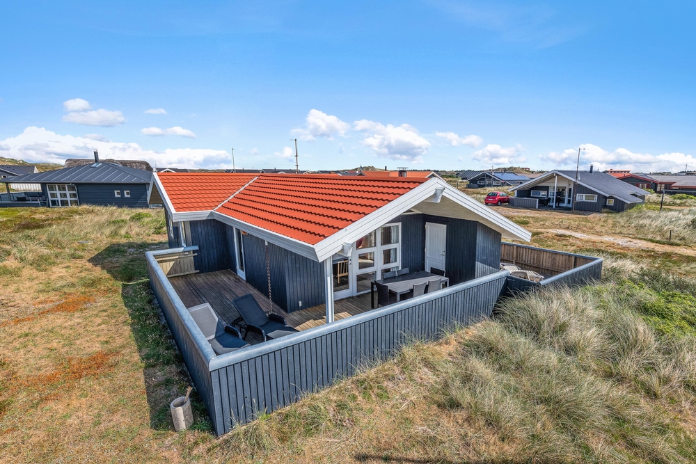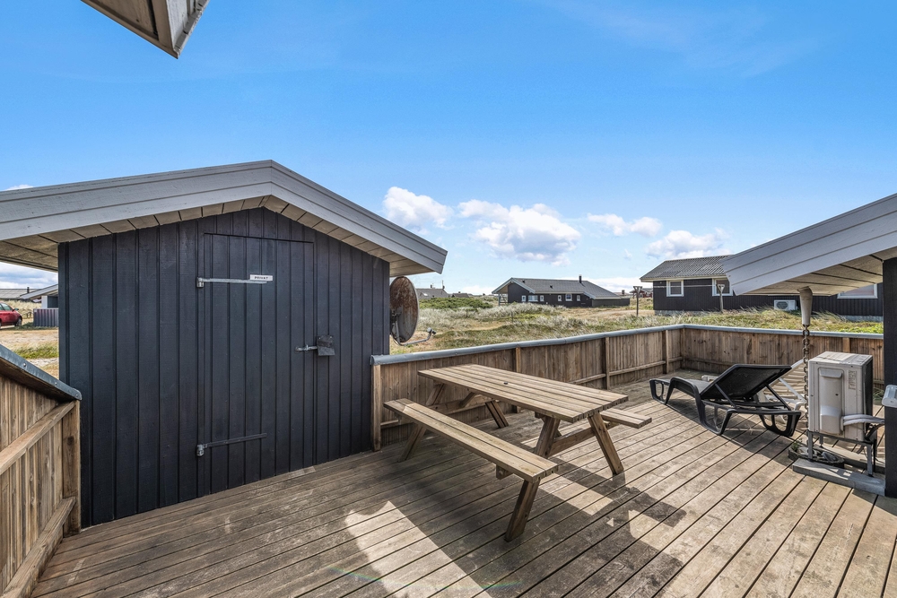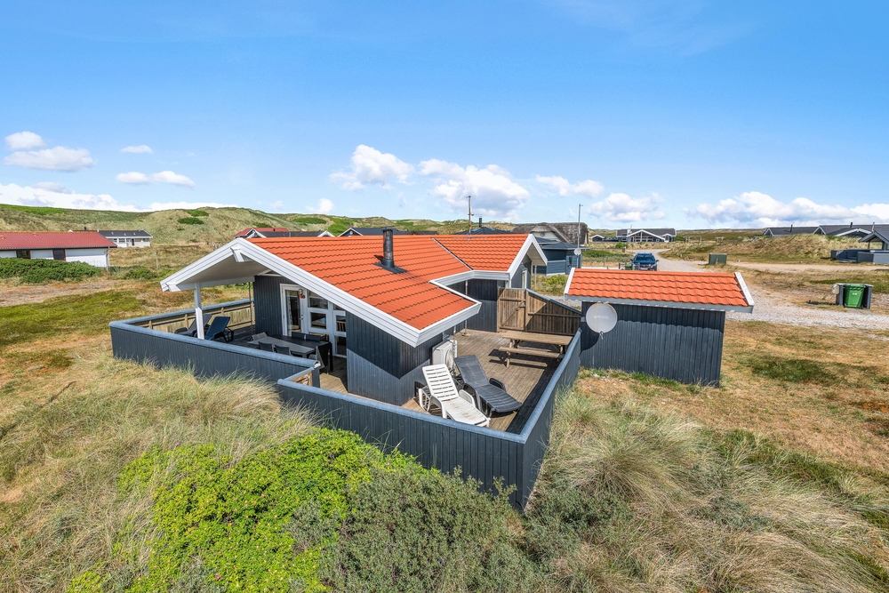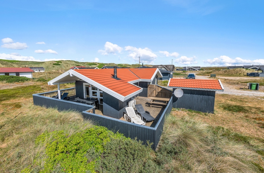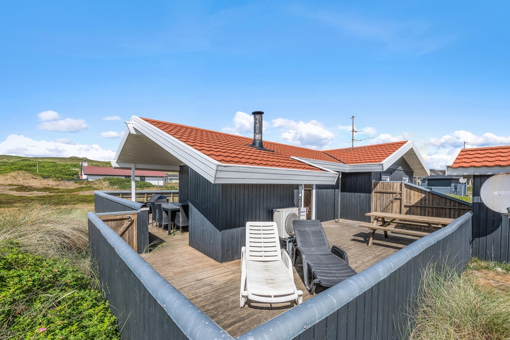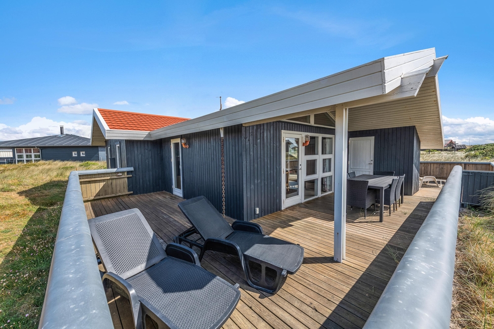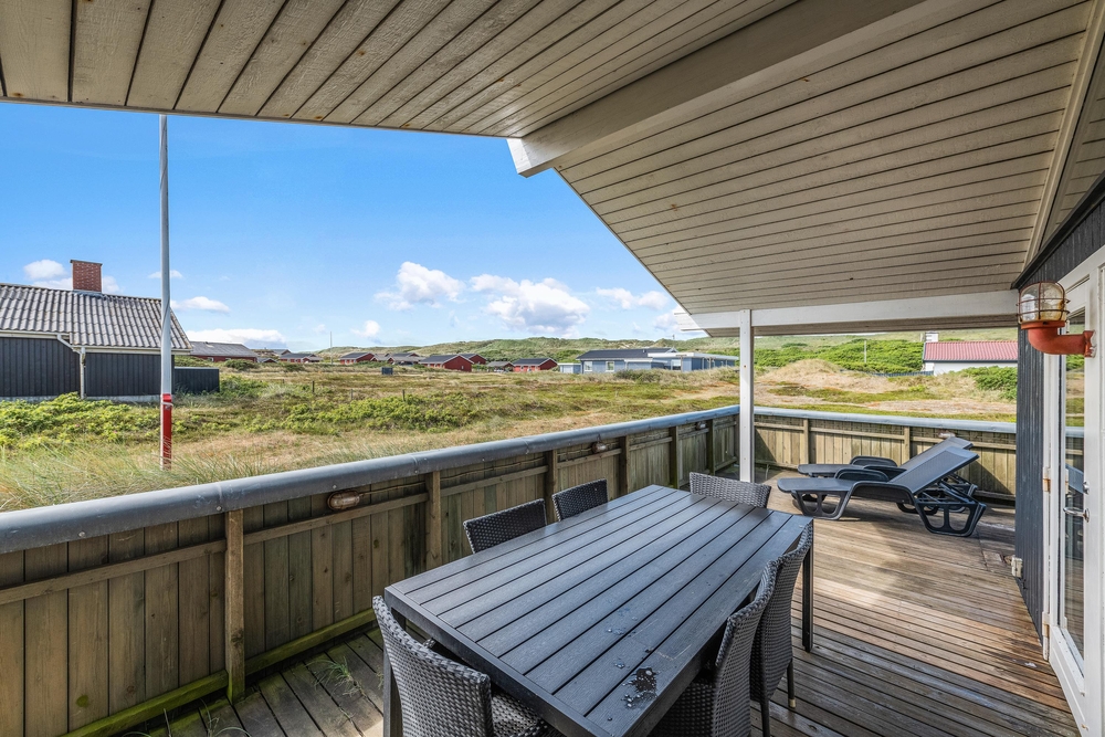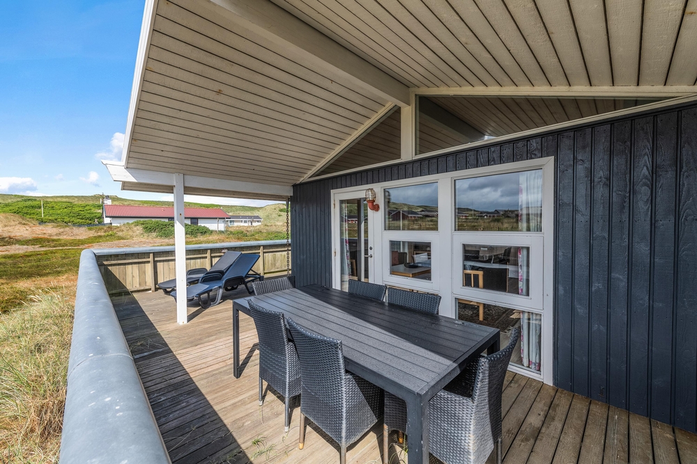 Auf gleich drei Seiten des Ferienhauses verläuft die geschlossene und teils überdachte Terrasse. Hier könnt ihr also mit der Sonne wandern und zu jeder Zeit einen Platz zum Entspannen finden. Genießt einen frisch gebrühten Kaffee und lasst euren Blick über das große Naturgrundstück und hin zu den Dünen schweifen. Sonnenliegen und bequeme Gartenmöbel laden zum Verweilen ein. Von hier aus könnt ihr sogar die nahe Nordsee rauschen hören.