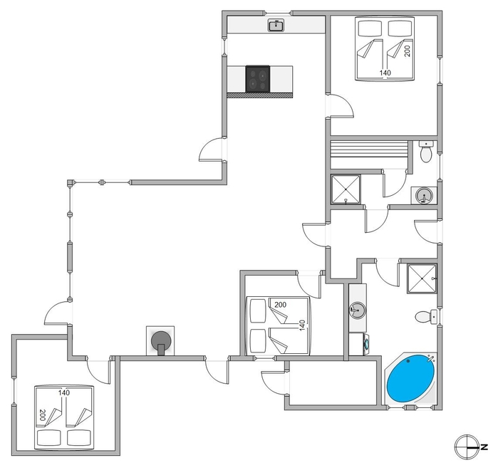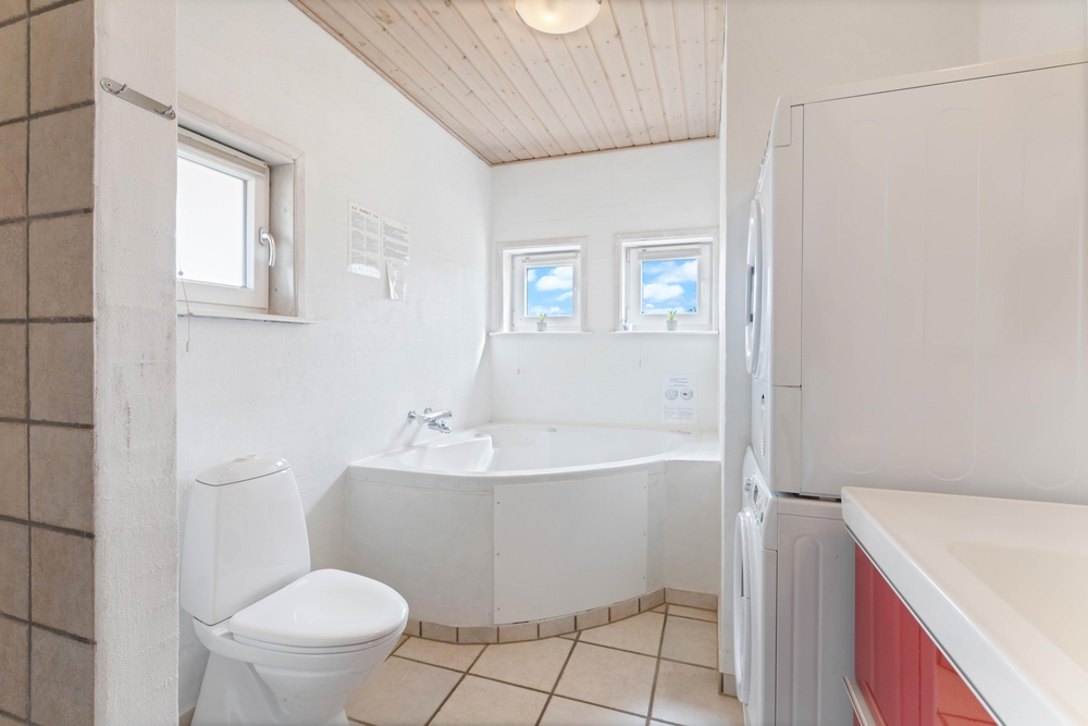 Die Küche wurde offen mit dem Essbereich kombiniert. Außerdem gibt es 2 Badezimmer; in dem einen stehen ein Whirlpool, Waschmaschine und Wäschetrockner zur Verfügung und in dem anderen befindet sich eine Sauna. Desweiteren verfügt das Haus über einen kostenlosen Internetzugang.