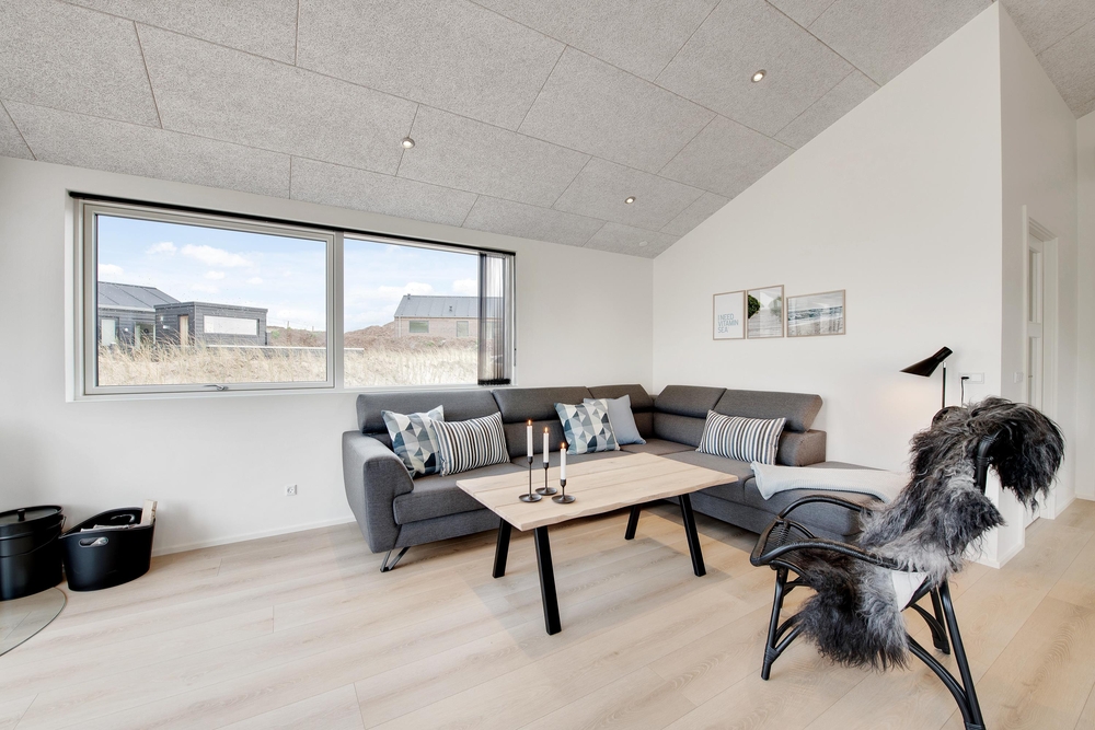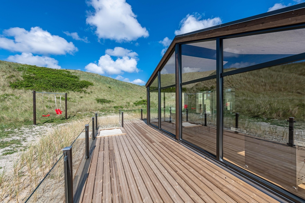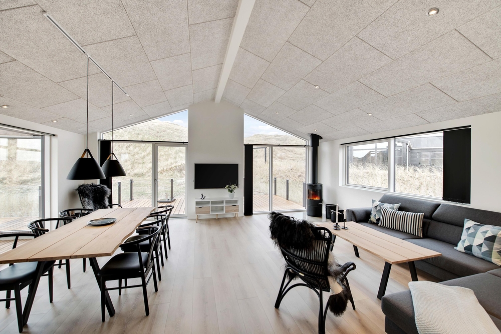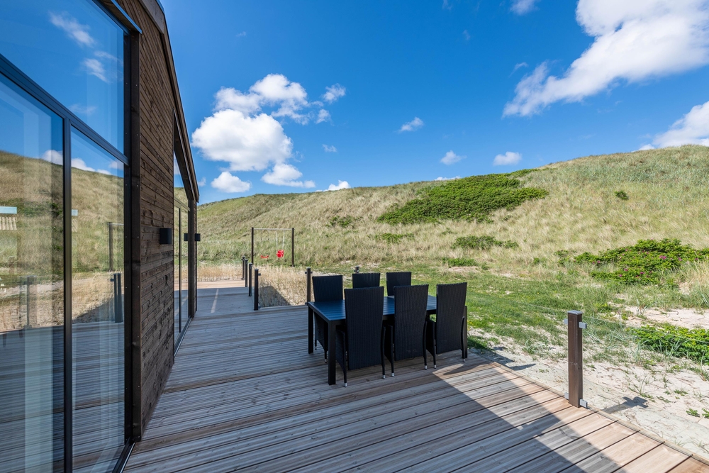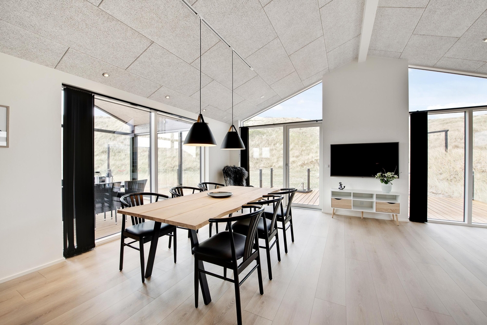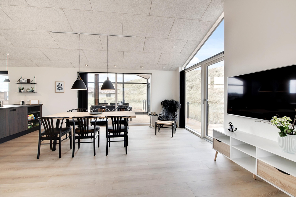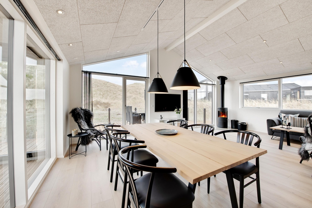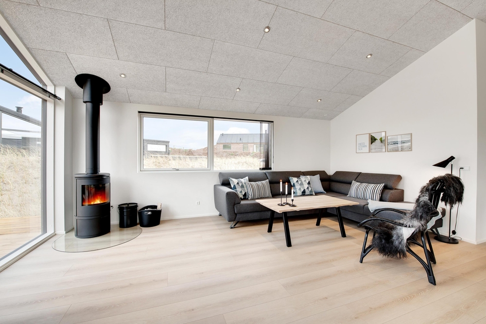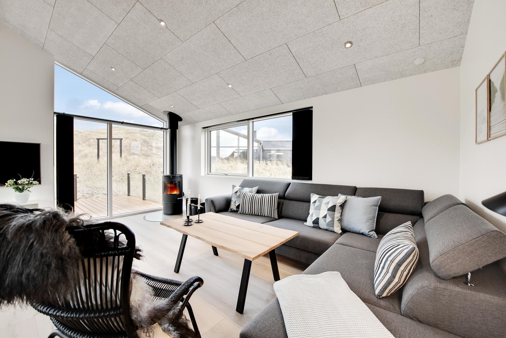 Die grossen Panoramfenster lassen viel Licht und Sonnenschein ins Haus und machen die schöne Umgebung noch einladender. Besonders der lichtdurchflutete Wohnraum mit der offenen Küche ist hell und freundlich und lädt zu vielen schönen Ferienstunden ein. Die moderne Küche lässt die Herzen der Hobbyköche höher schlagen. Hier könnt Ihr, mit Aussicht auf die umliegende Dünenlandschaft, die leckersten Ferienmahlzeiten zubereiten. An kühleren Tagen sorgt der knisternde Kaminofen für eine wohlige Wärme, während draussen vor den grossen Panoramafenstern, fast zum Greifen nah, der rauhe Westwind das Dünengras zerzaust.