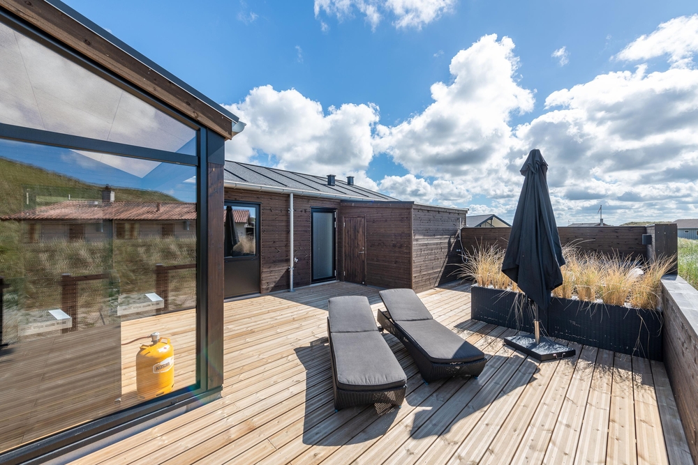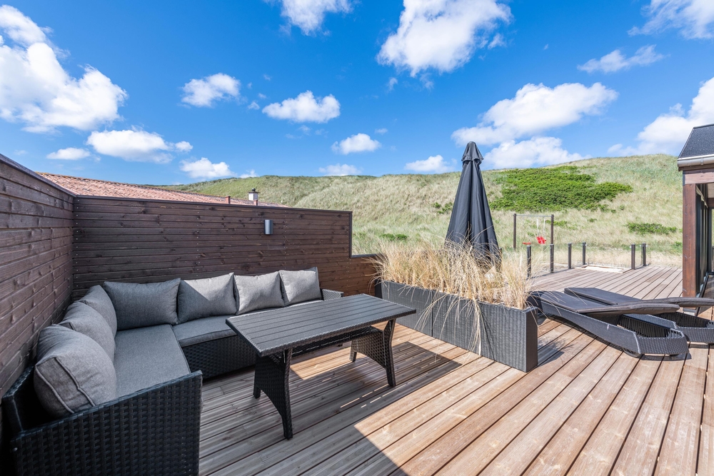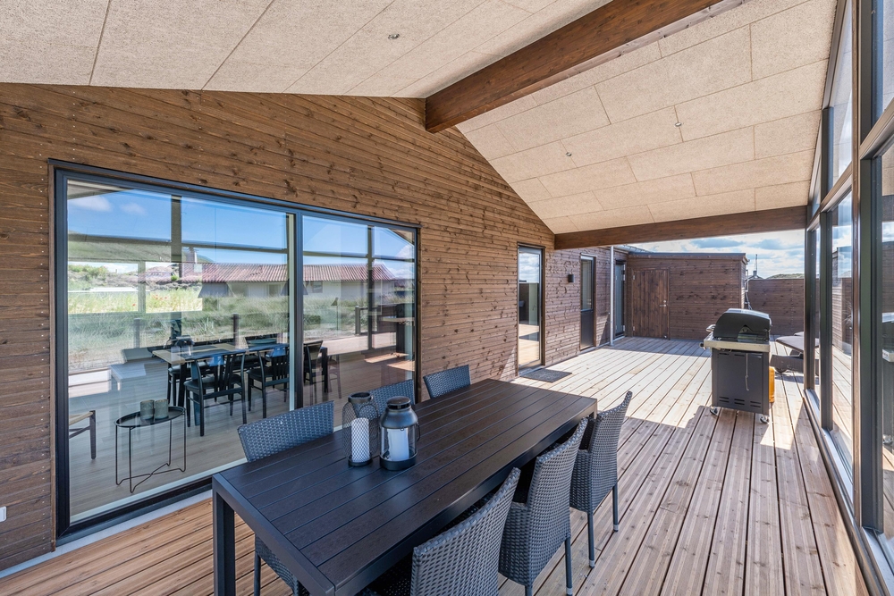 Vom Wohraum aus habt Ihr Zugang zur grossen, mit bequemen Gartenmöbeln ausgestatteten Terrasse, die sich um alle Sonnenseiten des Hauses zieht. Beim Sonnenbaden und beim abendlichen Grillen könnt Ihr das Rauschen der nahegelgenen Nordsee hören.