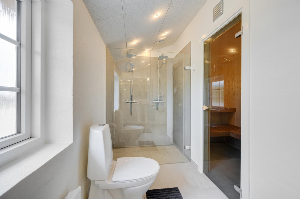 Mit zwei Badezimmern mit Fußbodenheizung bekommt ihr keine kalten Füße auf dem Weg in die Sauna ? dem Highlight des wundervollen Hauses. Diese sorgt für entspannte Stunden und um richtig im Urlaub abzuschalten. In dem großen Badezimmer ist des Weiteren eine Doppeldusche installiert.