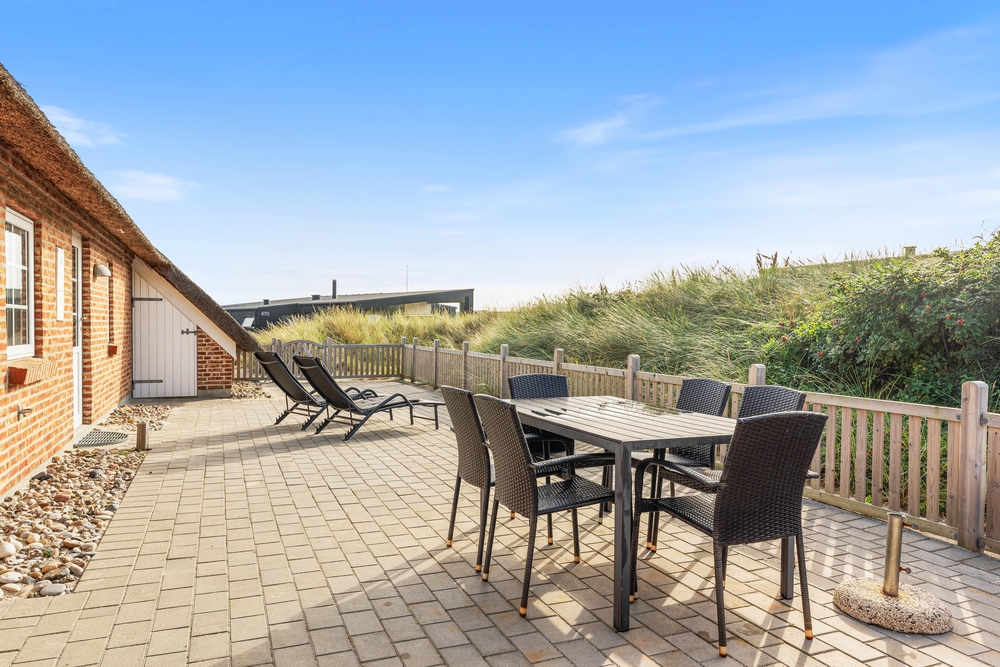 Die großen Fenster im Wohnbereich geben einen großartigen Lichteinfall und eine Panoramaaussicht auf die Dünen, hinter denen sich direkt der Sandstrand in beide Richtungen kilometerweit ausbreitet. Vom Wohnraum habt ihr die Möglichkeit sowohl einen schönen Platz auf der süd- als auch auf der westgewendeten Terrasse zu finden und dem Rauschen des Meeres zu lauschen.
