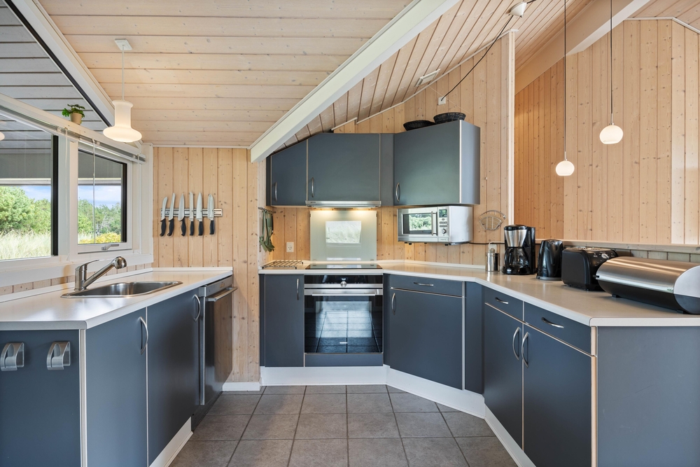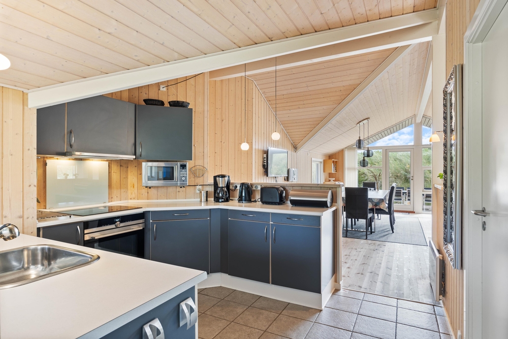 Die gut ausgestattete Küche mit Fußbodenheizung und Klinkerboden lädt zu gemeinsamen Kochabenden ein. Dank Spülmaschine, Mikrowelle, 60 l Gefriermöglichkeit und Induktionsherd wird das Kochen zum Kinderspiel. Wie wäre es einmal mit einem dänischen Menü, welches die ganze Familie zusammen zubereitet?