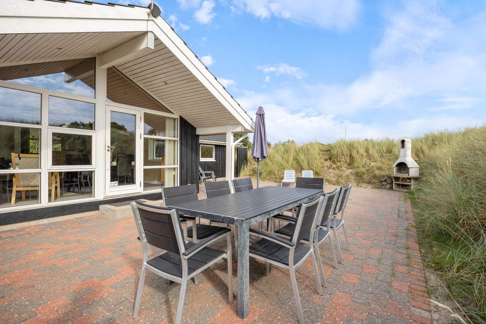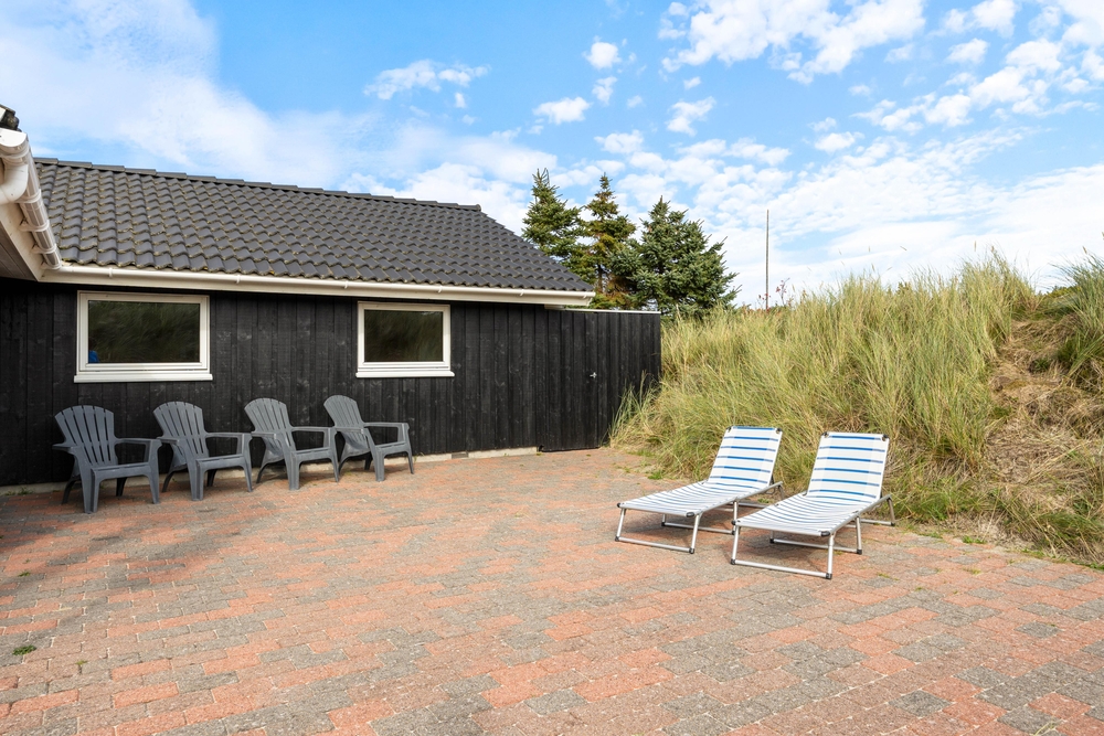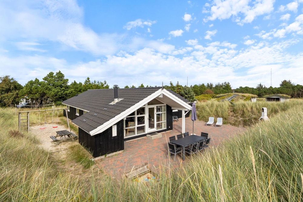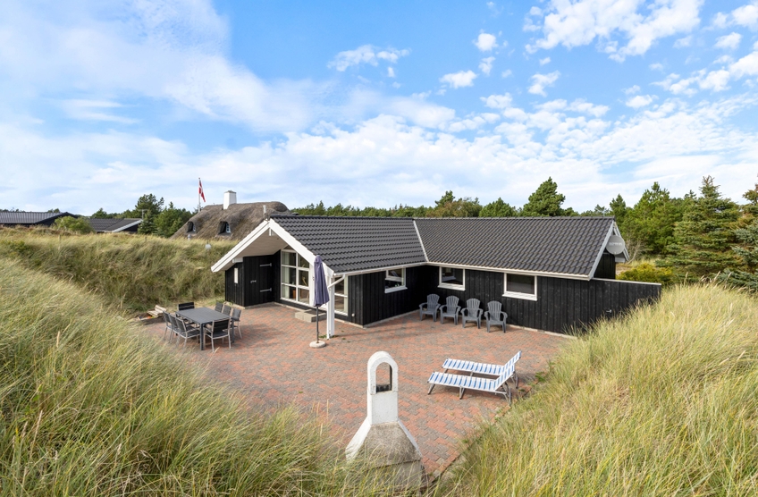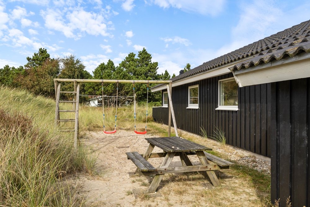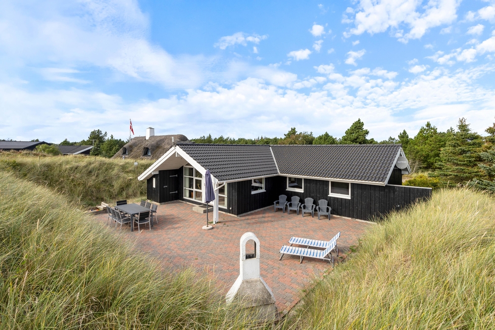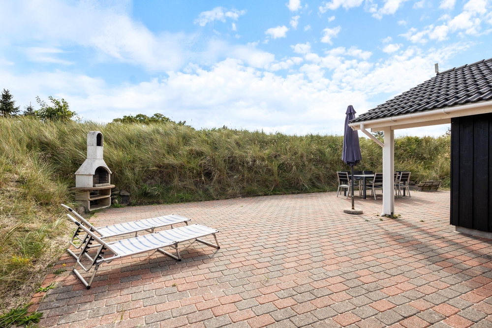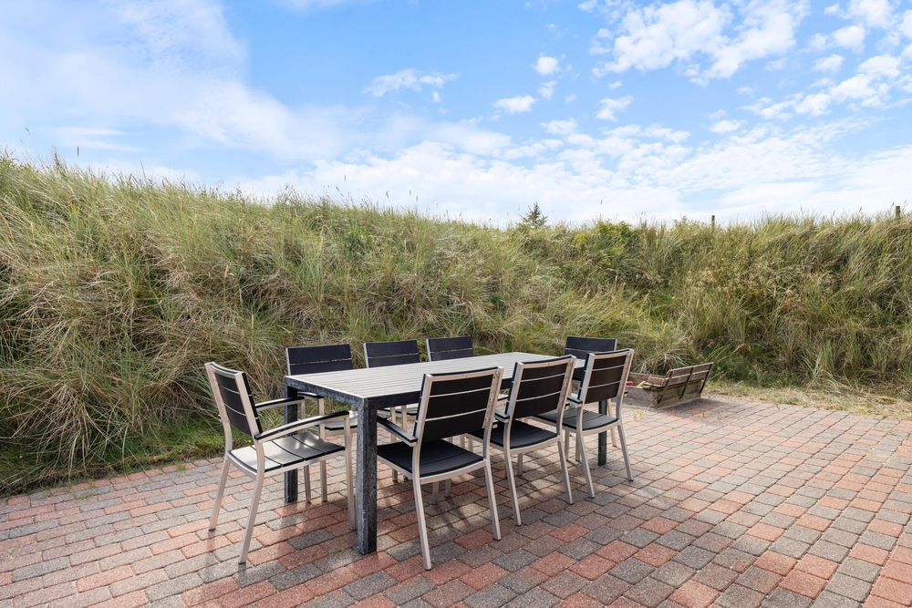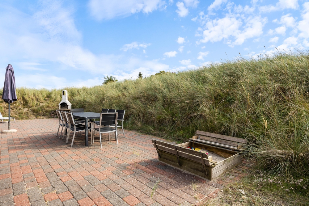 Vom Wohnbereich aus gelangt ihr auf die schön angelegte, teils überdachte Steinterrasse. Diese ist von einer Düne umgeben, die euch zugleich Windschutz und Privatsphäre bietet. So könnt ihr euch mit einer Tasse Kaffee in den bequemen Gartenmöbeln oder Sonnenliegen entspannen, während eure Kinder im Sandkasten spielen, schaukeln oder das Naturgrundstück erkunden.