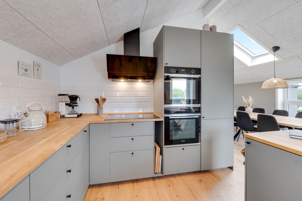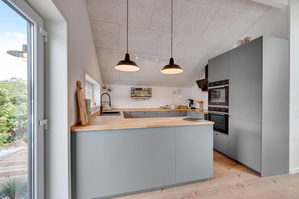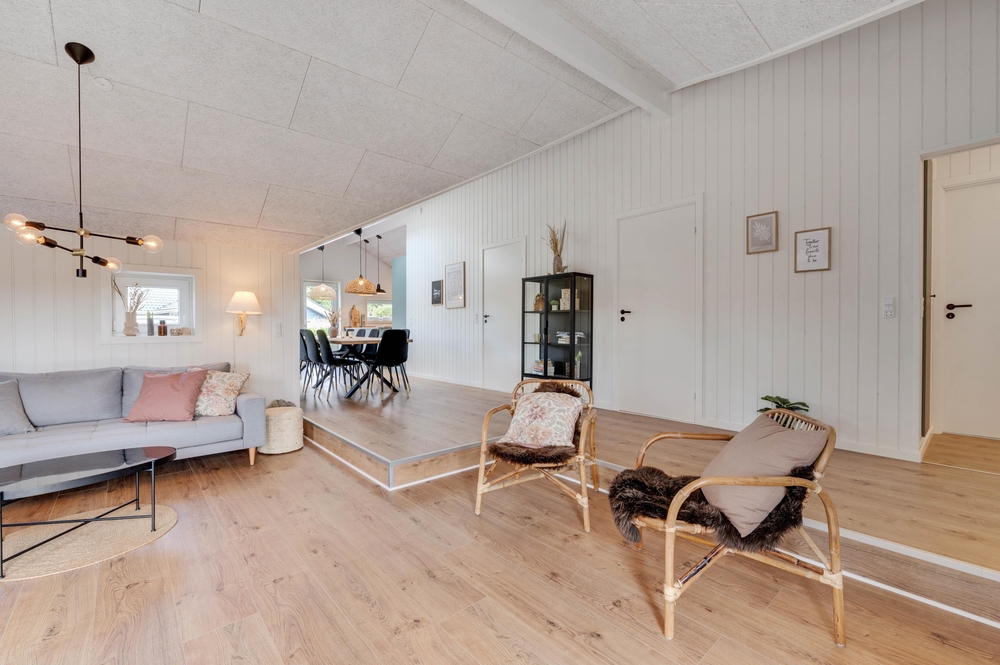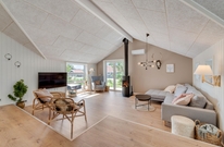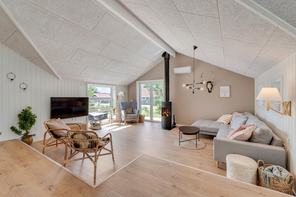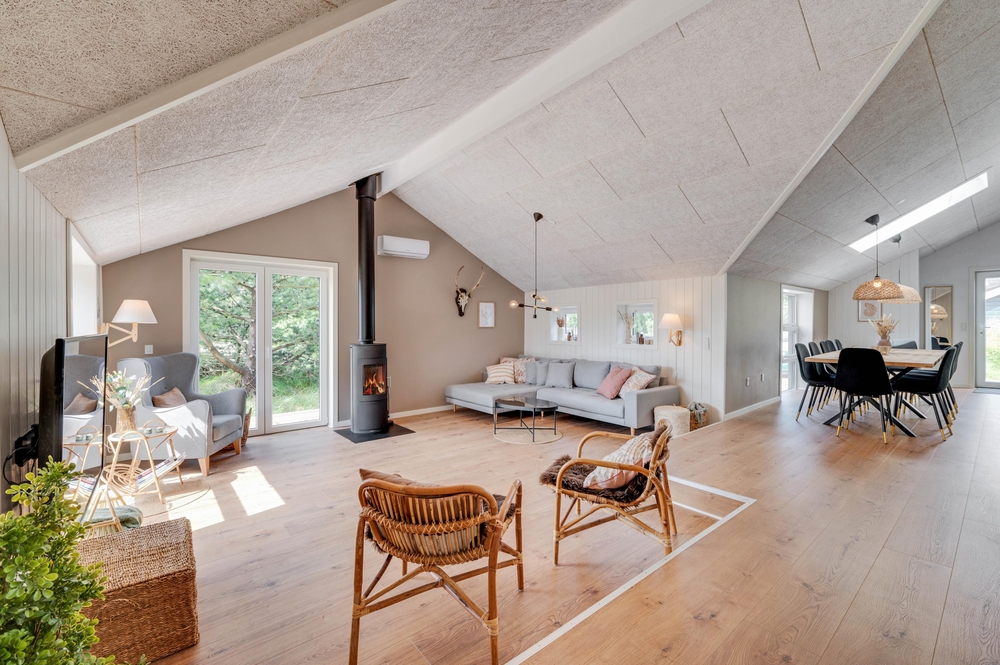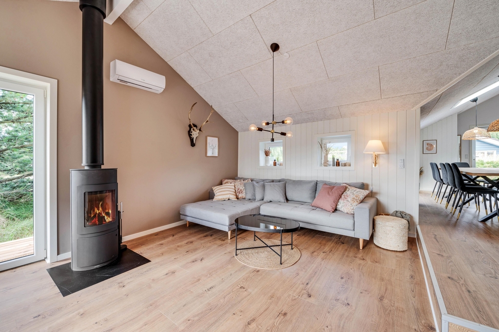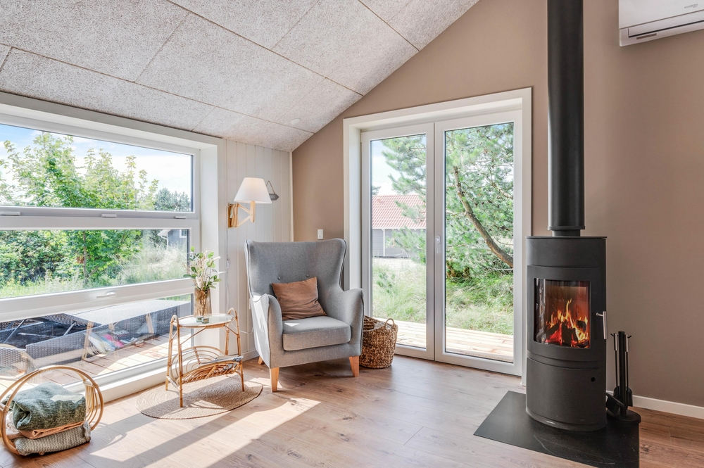 Die Küche liegt in offener Verbindung mit dem Wohnbereich, der durch seine hohen Decken und dem zentral platzierten Kamin viel Gemütlichkeit ausstrahlt. An den kühleren Tagen kann die energiesparende Wärmepumpe eingeschaltet werden. Die Sitzecke lädt zum Kartenspielen oder zum gemeinsamen Filmabend ein, Chromecast ist ebenfalls installiert. Es gibt 3 deutsche Kanäle in diesem Ferienhaus.