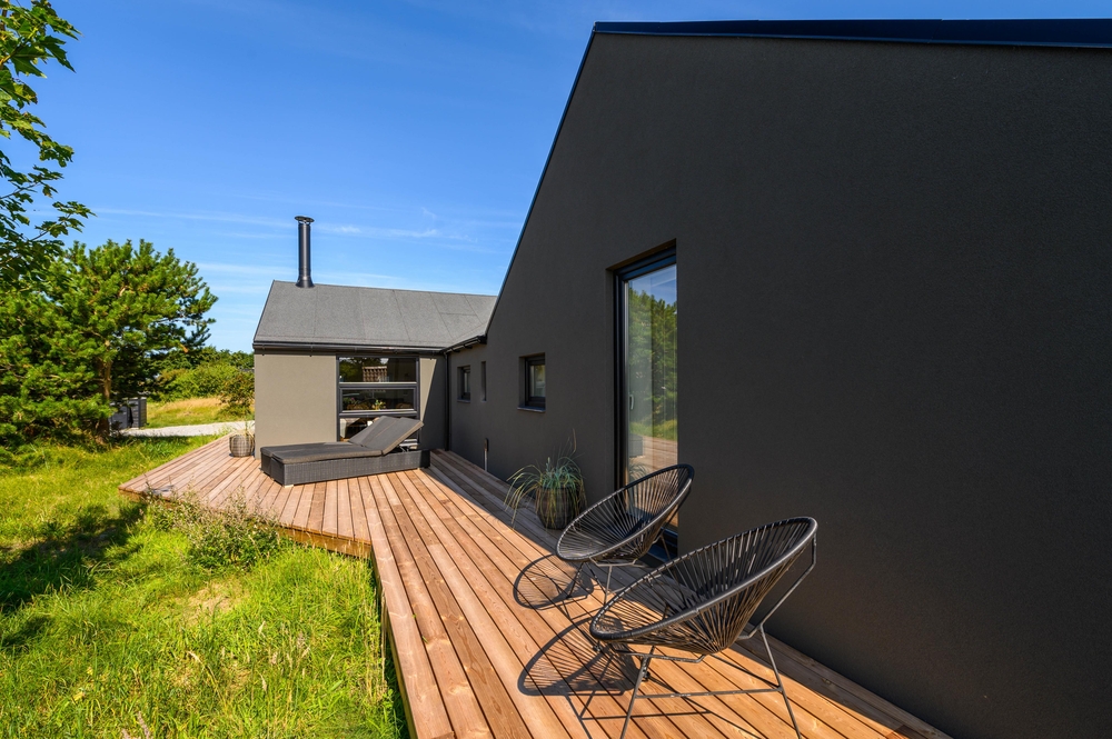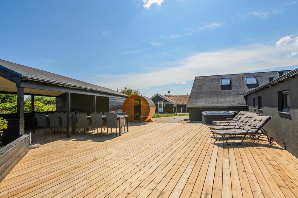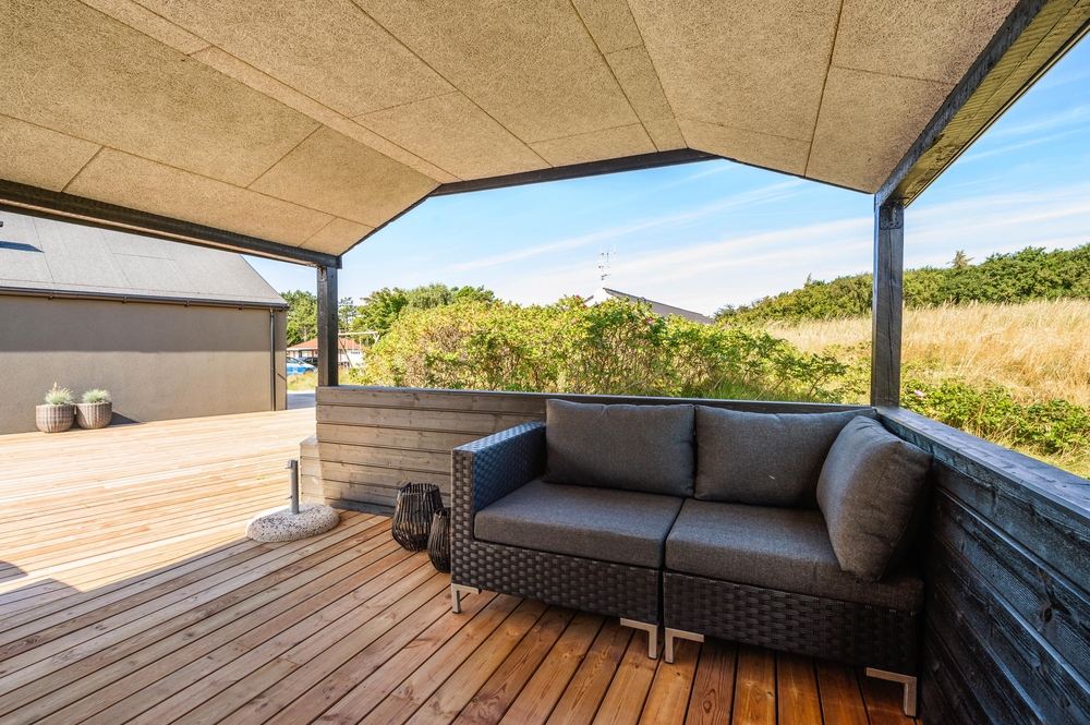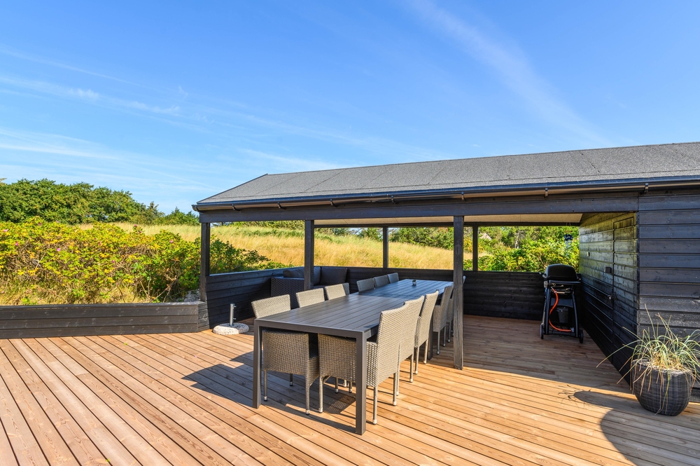 Auf der großen ostgewendeten Terrasse, die sich hinter dem Ferienhaus befindet und sowohl abgeschirmt als auch teilweise überdacht ist, könnt ihr den ganzen Tag draußen verbringen und mit einer Tasse Kaffee und dem neuesten Krimi den Tag genießen und entspannen.