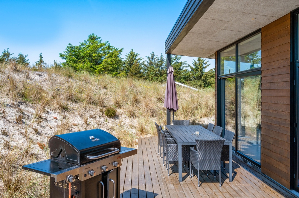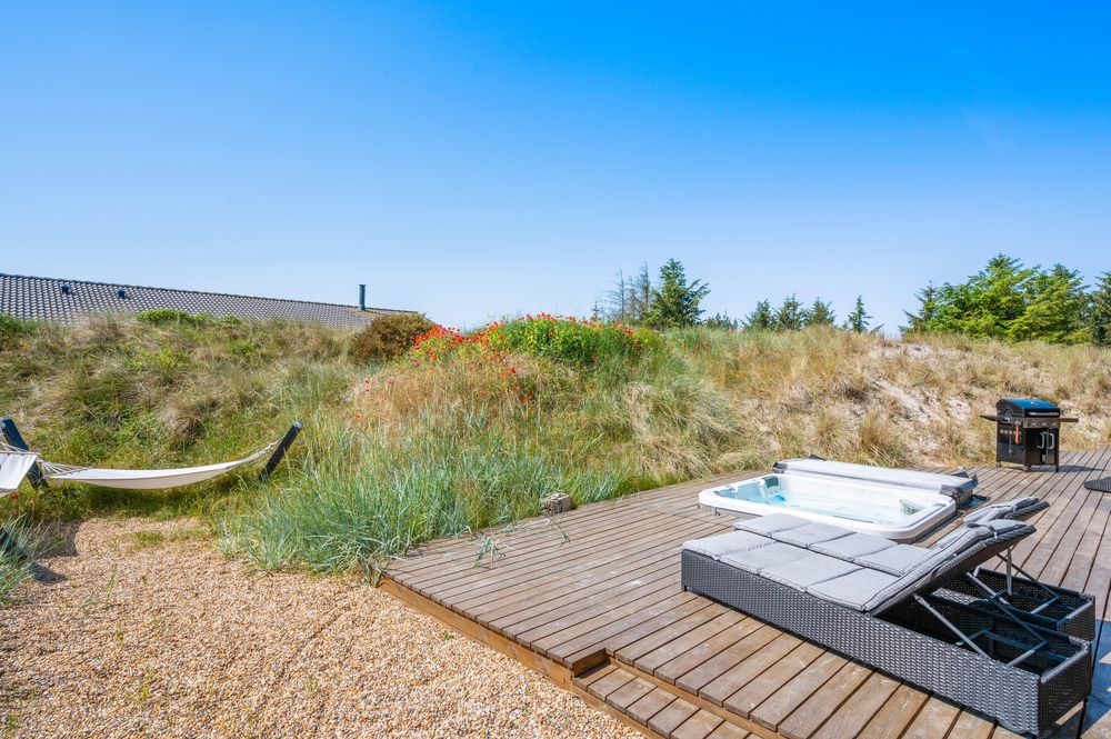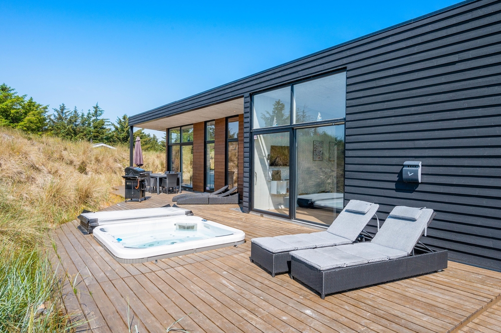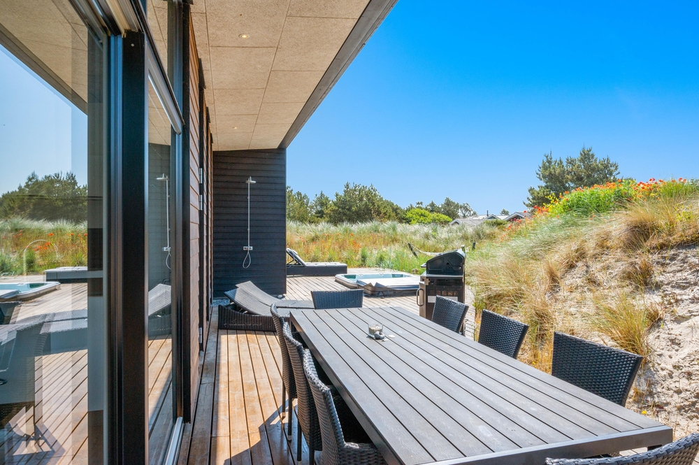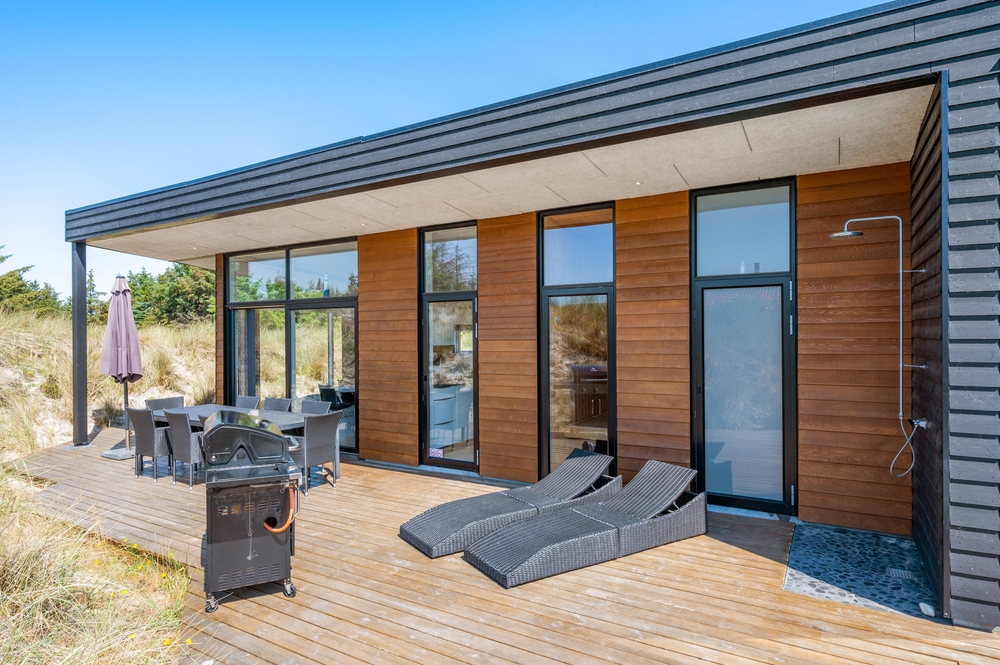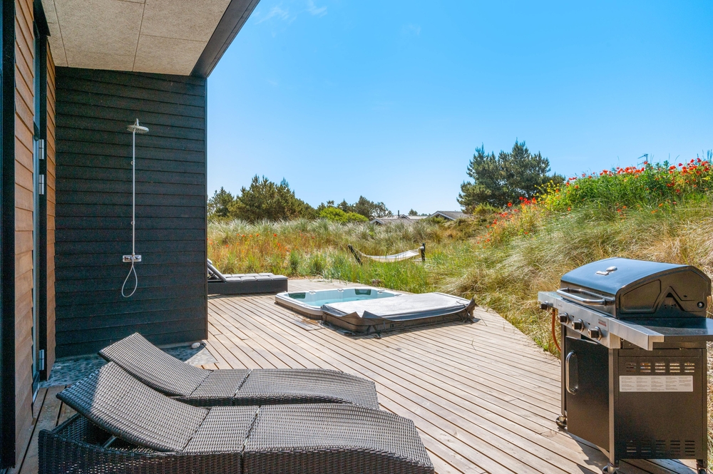 Die Holzterrasse führt fast um das komplette Haus und bietet viele gemütliche und windgeschützte Bereiche. Hier könnt ihr ein ausgiebiges Sonnenbad nehmen und am Abend den Grill anheizen und mit der ganzen Familie unter dem überdachten Teil der Terrasse entspannt zusammen sitzen und nach einem gelungenen Abendessen den güldenen Schein der untergehenden Sonne vom Whirlpool aus genießen.
