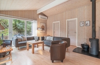 Im Zentrum des Ferienhauses liegt der helle, offene Wohnbereich, der mit bodentiefen Fenstern ausgestattet ist, was für viel natürliches Licht sorgt. Gleichzeitig kannst du den Blick nach Draußen schweifen lassen. Bequeme Sitzmöbel laden zum Verweilen ein, während du bei einem Film den Abend ausklingen lässt. Der prasselnde Kaminofen sorgt für wohlige Wärme, ergänzt durch eine energiesparende Wärmepumpe, die die Temperatur angenehm hält.
