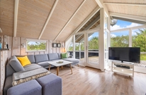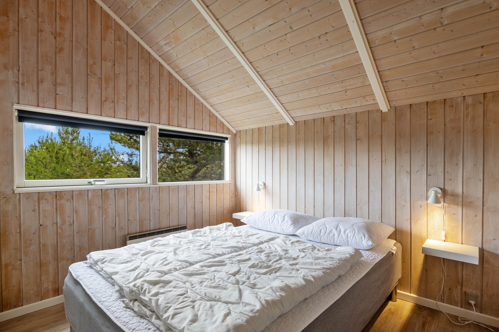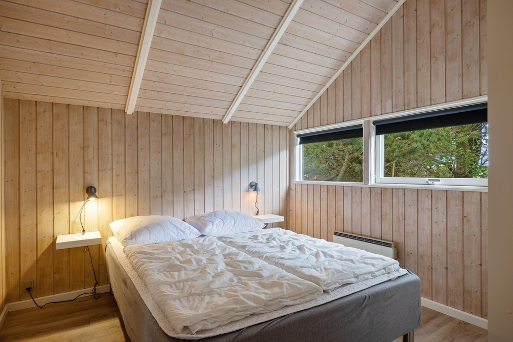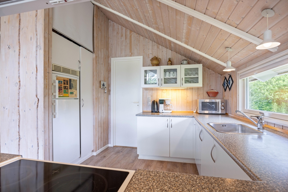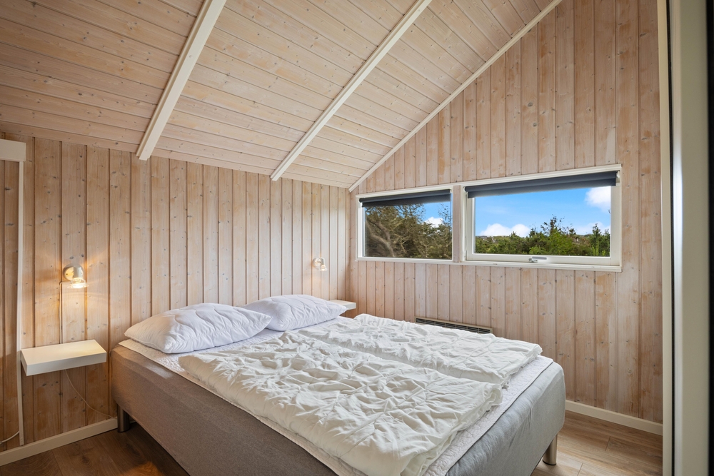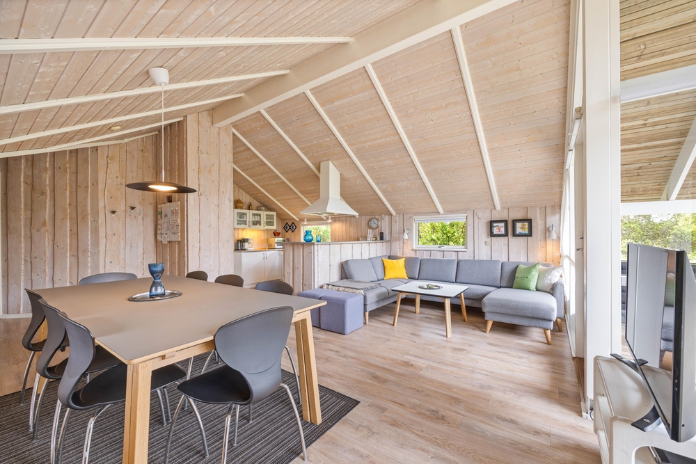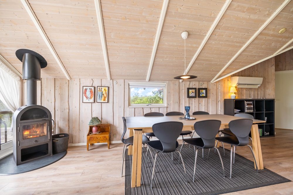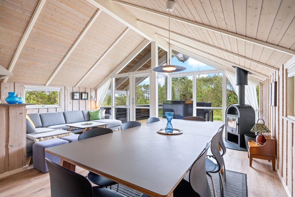 Dieses Ferienhaus bietet eine perfekte Kombination aus Komfort und Praktikabilität, besonders für zwei Parteien, die zusammen reisen, aber dennoch ihre Privatsphäre genießen möchten. Der Wohnbereich ist durch seine große Fensterfront besonders hell und einladend. Er ist mit Holzboden, einem kuscheligen Sofa und einem schönen Kamin ausgestattet, der eine hyggelige Stimmung verbreitet.