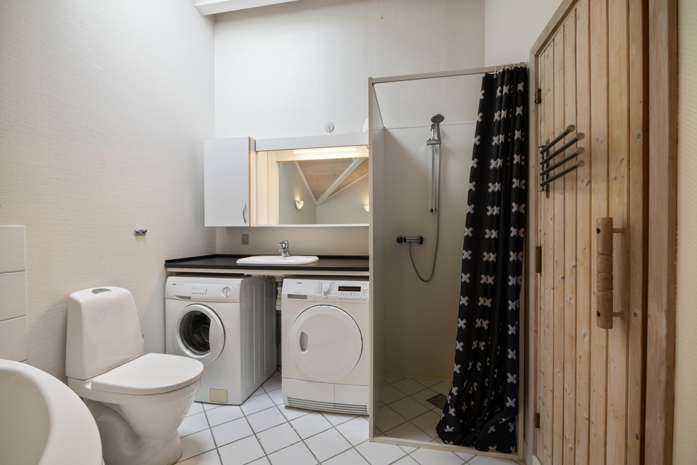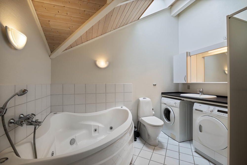 Die offene Küche lässt keine Wünsche offen und um den Abwasch kümmert sich die Spülmaschine. So könnt ihr am großzügigen Esstisch einen Spieleabend verbringen. Wollt ihr energiesparend heizen, könnt ihr die Wärmepumpe nutzen. Zum Entspannen nach einem erlebnisreichen Tag stehen euch Sauna und Whirlpool zur Verfügung. Diese befinden sich im Badezimmer, welches mit Fußbodenheizung und Dusche ausgestattet ist. Auch die Waschmaschine und ein Trockner findet ihr hier, so könnt ihr stets für frische Handtücher sorgen.