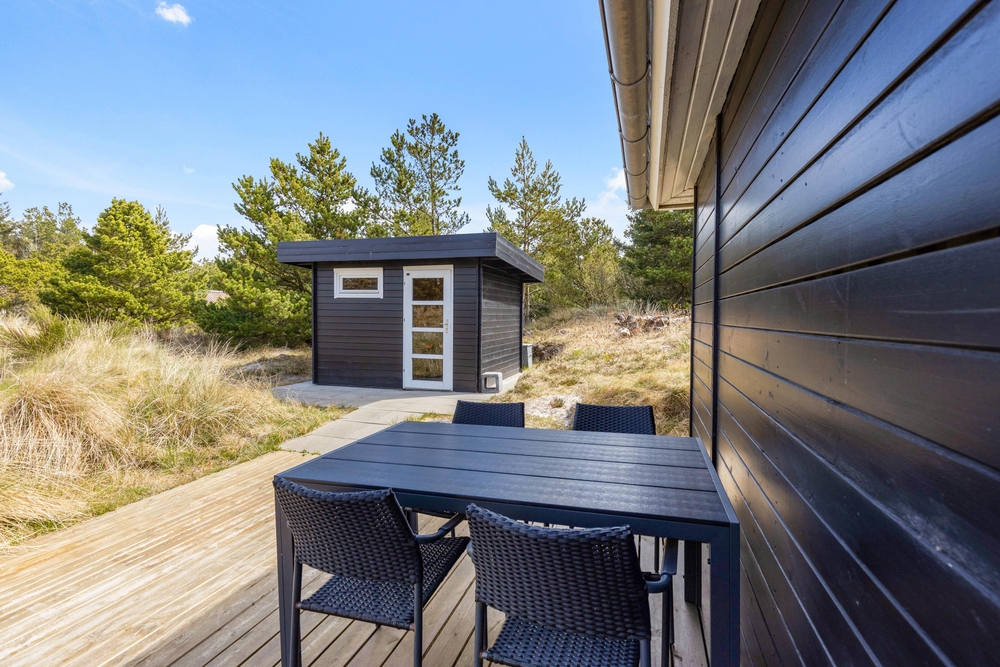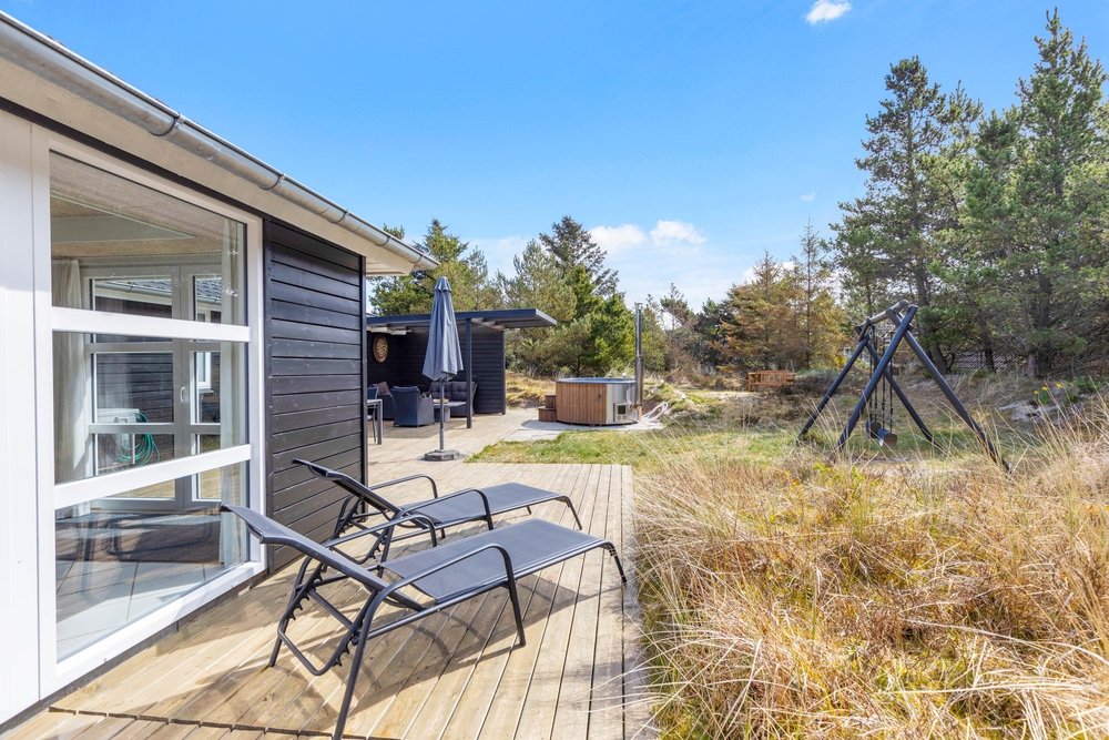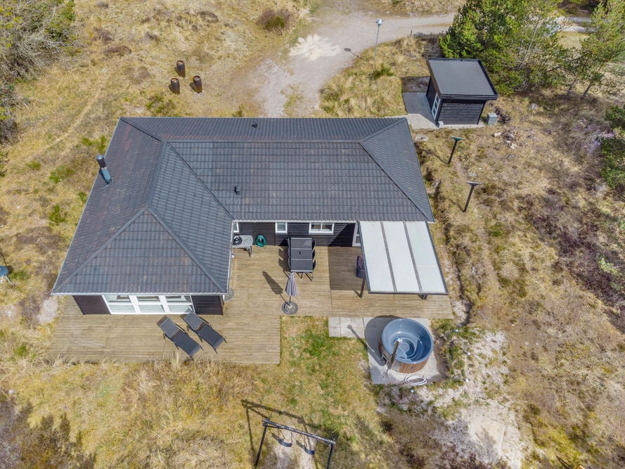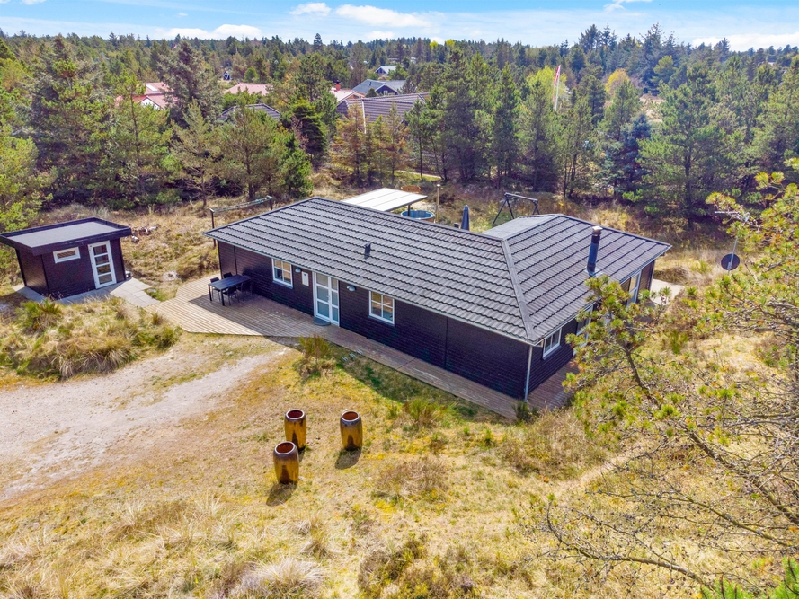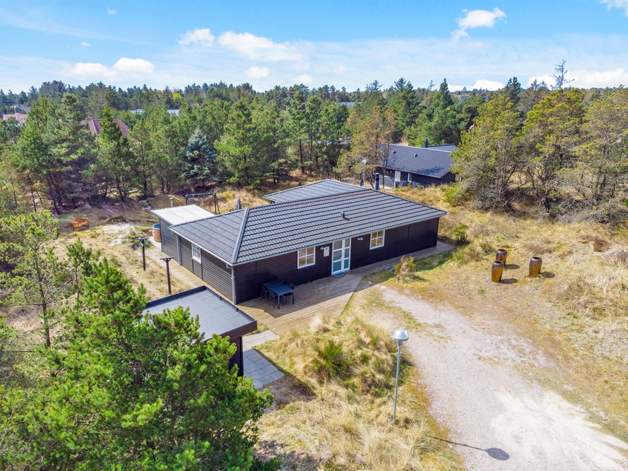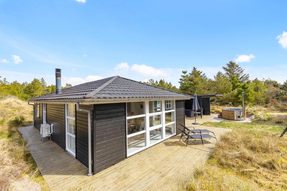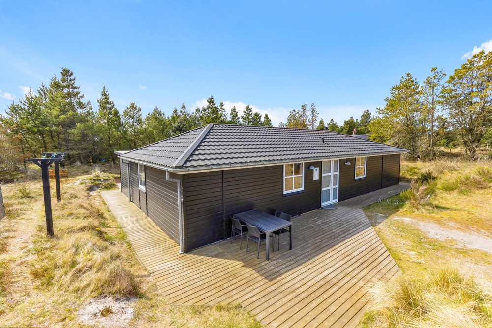 In der schönen und vielseitigen Natur Blåvands zwischen Dünen und hohen Tannen liegt dieses stilvolle Ferienhaus mit Aktivitätsraum. Es hat eine tolle Lage und ihr könnt euch auf einen ruhigen und entspannten Urlaub an der dänischen Westküste freuen. Auf der schönen Terrasse könnt ihr bei jedem Wetter die umliegende Natur genießen.