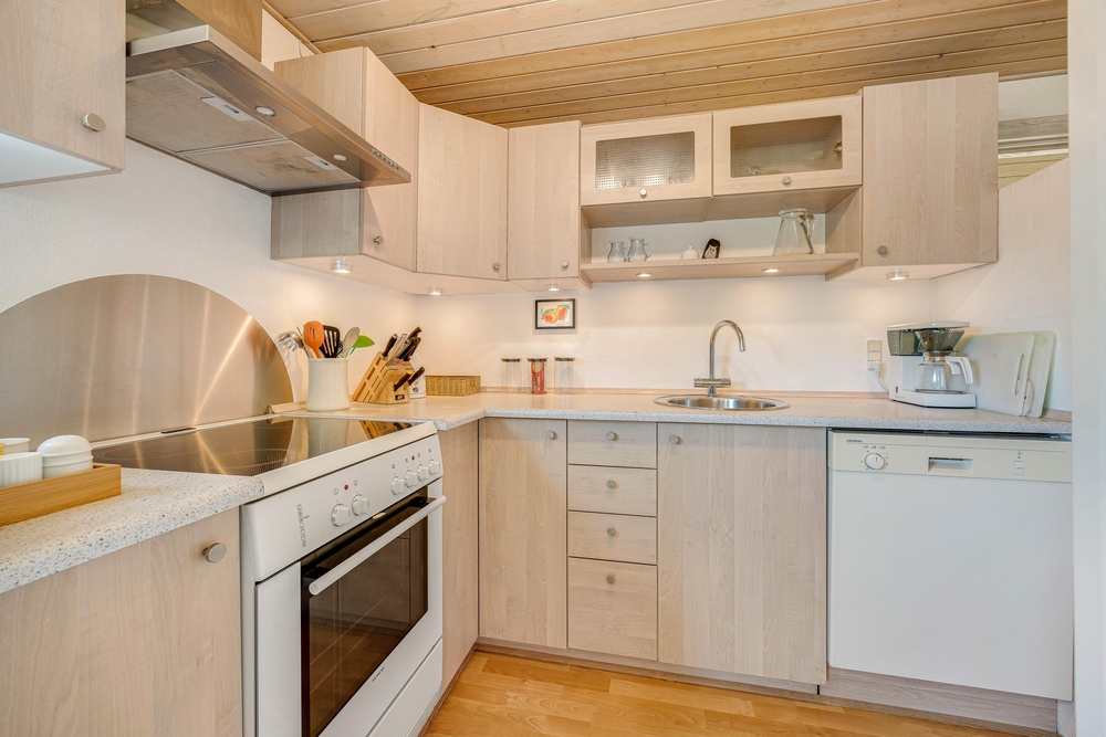 Die Küche mit offenem Wohn- Essbereich sind das Herz des Hauses, in dem Ihr gemütliche Ferienstunden miteinander verbringen könnt. Ihr könnt gemeinsam Kochen, einen Spiele- oder Filmeabend planen, oder einfach nur die Wärme und das Knistern des Feuers im Kaminofen genießen.