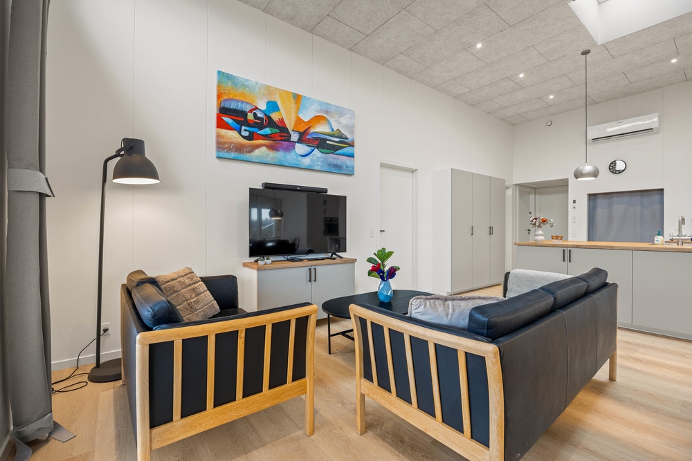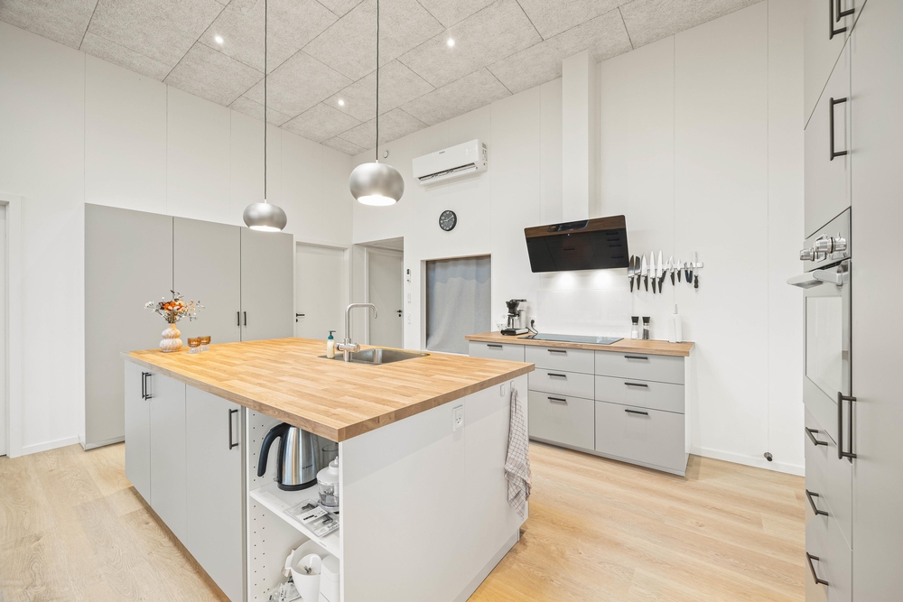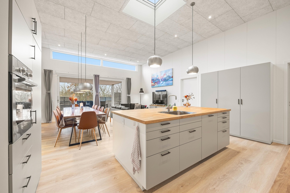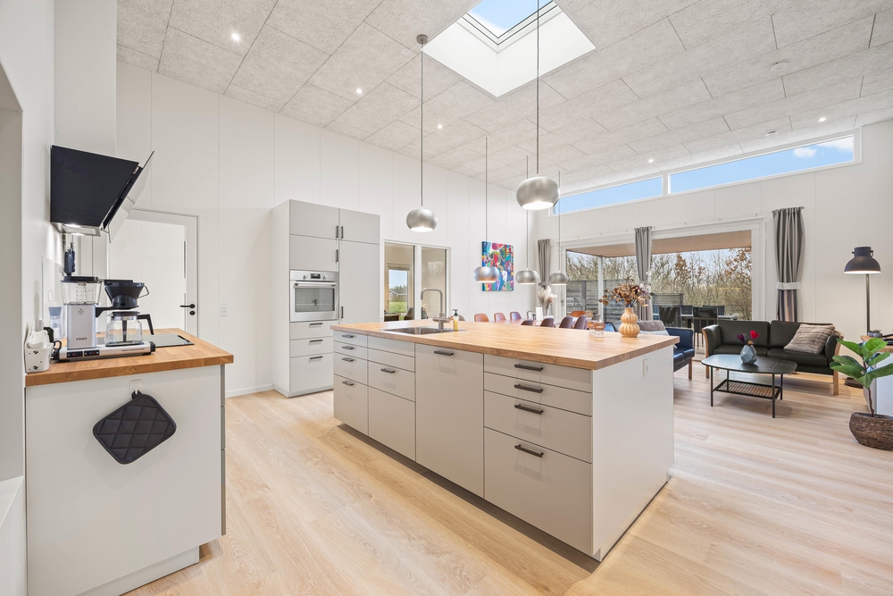 Das Herzstück dieses hell und freundlich eingerichteten Ferienhauses, bildet der großzügige Wohnraum mit offener Küche. Durch die große Fensterfront kommt viel Licht herein und ihr könnt den Ausblick nach draußen genießen. Kuschelt euch aufs Sofa und schaut gemeinsam einen Film oder versammelt euch in der gut ausgestatteten Küche für einen geselligen Kochabend. Wie wäre es einmal mit einem dänischen Themenabend?