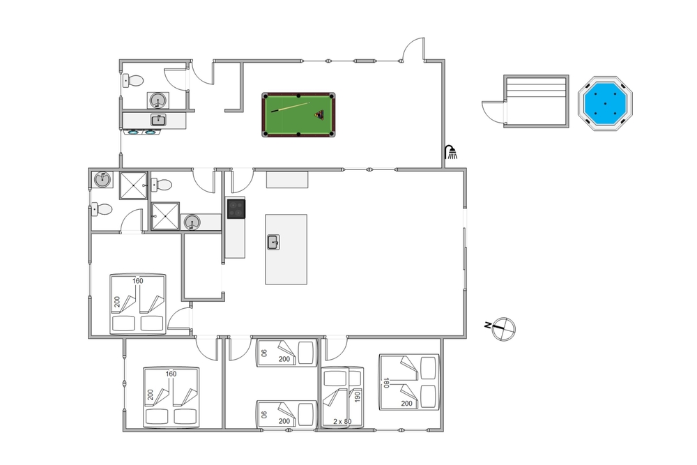 Danach könnt ihr euch im Aktivitätsraum austoben. Hier steht unter Anderem ein Billardbord für euch bereit. Insgesamt findet ihr 2 Bäder mit Fußbodenheizung und ein Gäste-WC in diesem modernen Ferienhaus ? so könnt ihr Wartezeiten vermeiden. Für eine erholsame Nachtruhe stehen euch insgesamt 4 gemütliche Schlafzimmer wie auch 2 Schlafplätze im Alkoven zur Verfügung. Hier könnt ihr eure Akkus wieder aufladen und erholt in den nächsten Urlaubstag starten.