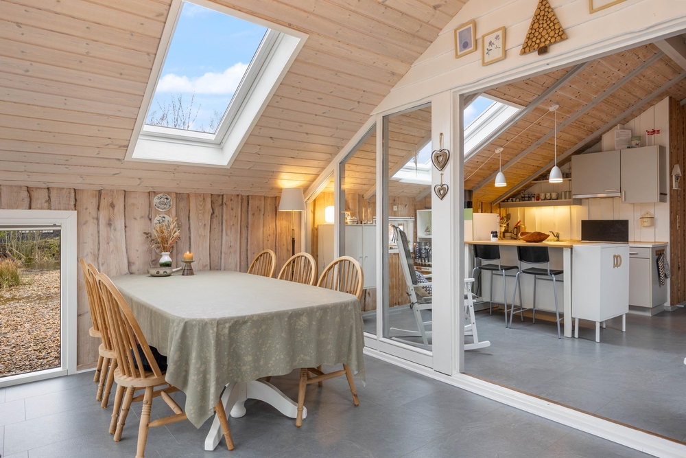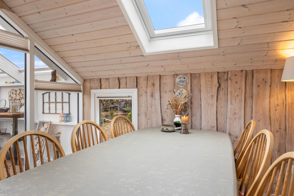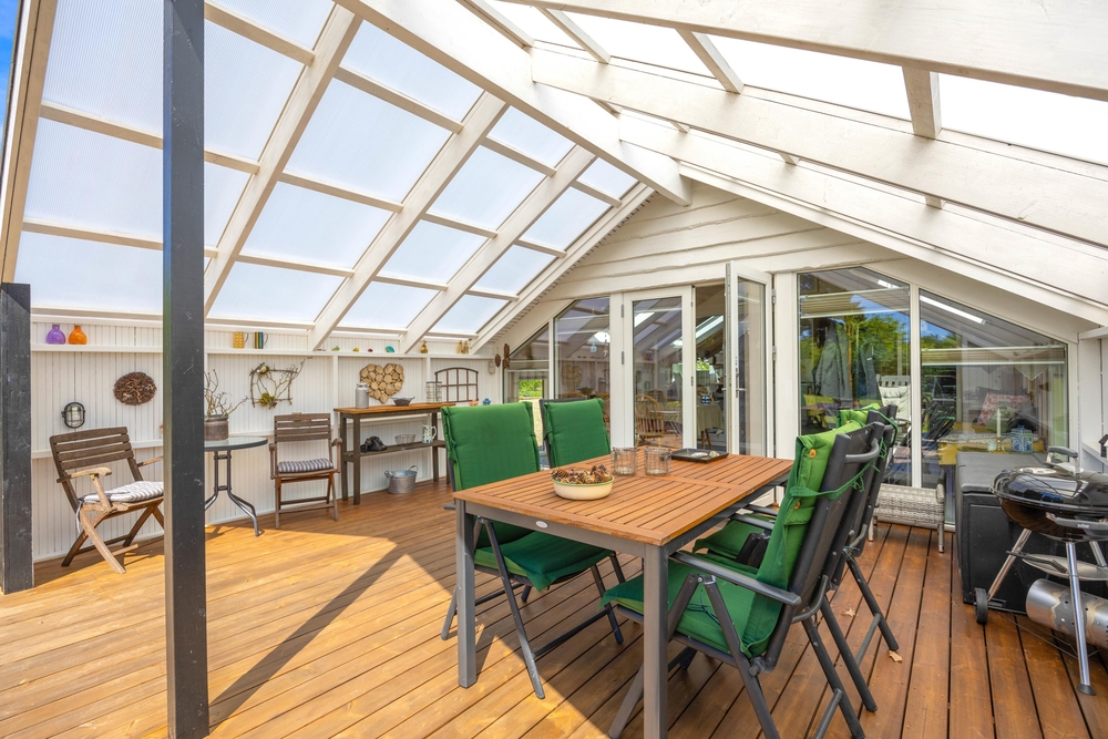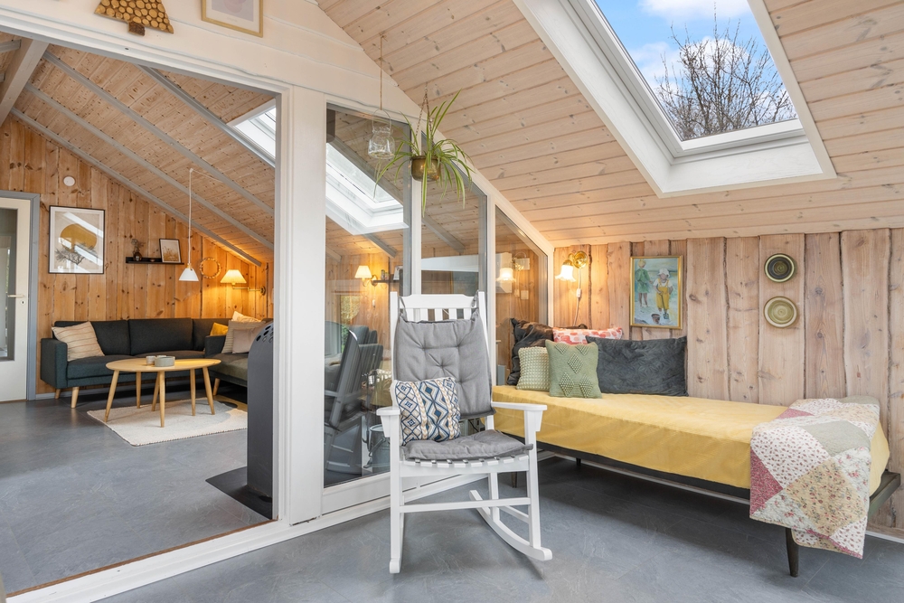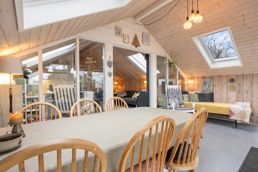 Das Wohnzimmer des Ferienhauses in Jegum Ferieland strahlt eine gemütliche und einladende Atmosphäre aus. Herzstück des Raumes ist der Kaminofen, der an kühleren Tagen für wohlige Wärme sorgt. Der Wintergarten des Ferienhauses im Blomstervangen 111 ist ein Highlight, das zu jeder Jahreszeit genutzt werden kann. Große Fensterfronten lassen viel natürliches Licht herein und schaffen eine helle, einladende Atmosphäre, die euch zum Verweilen einlädt.