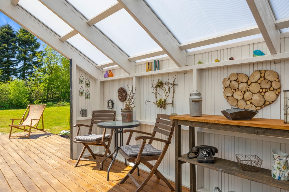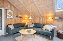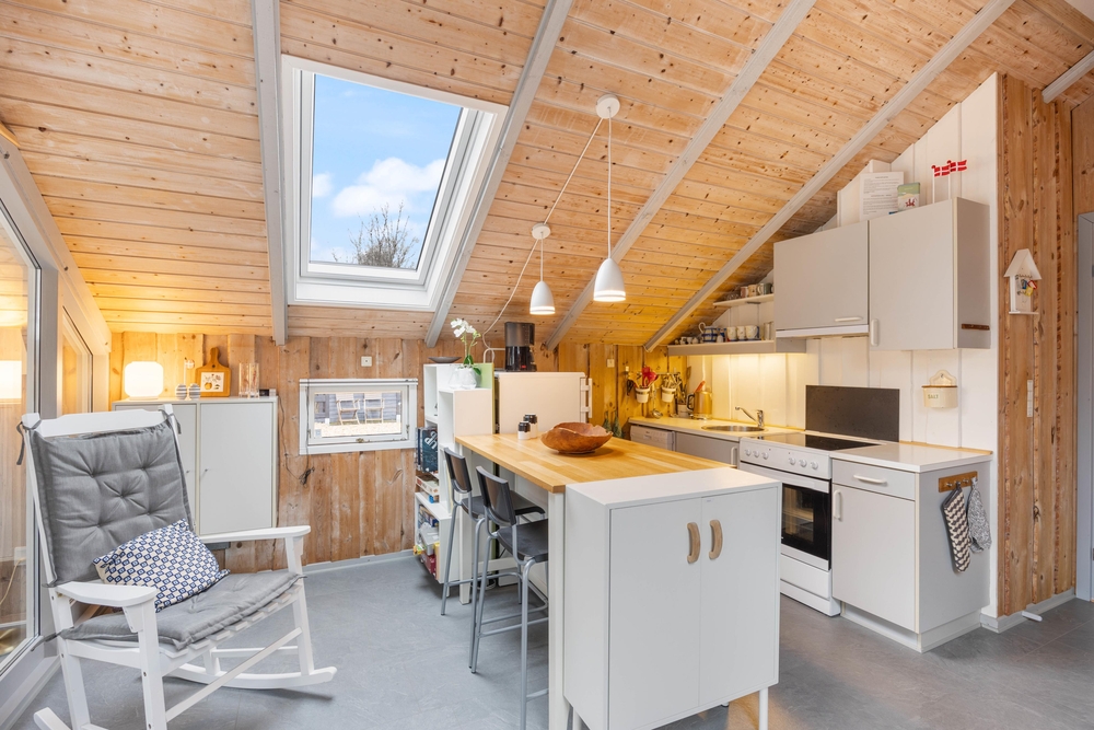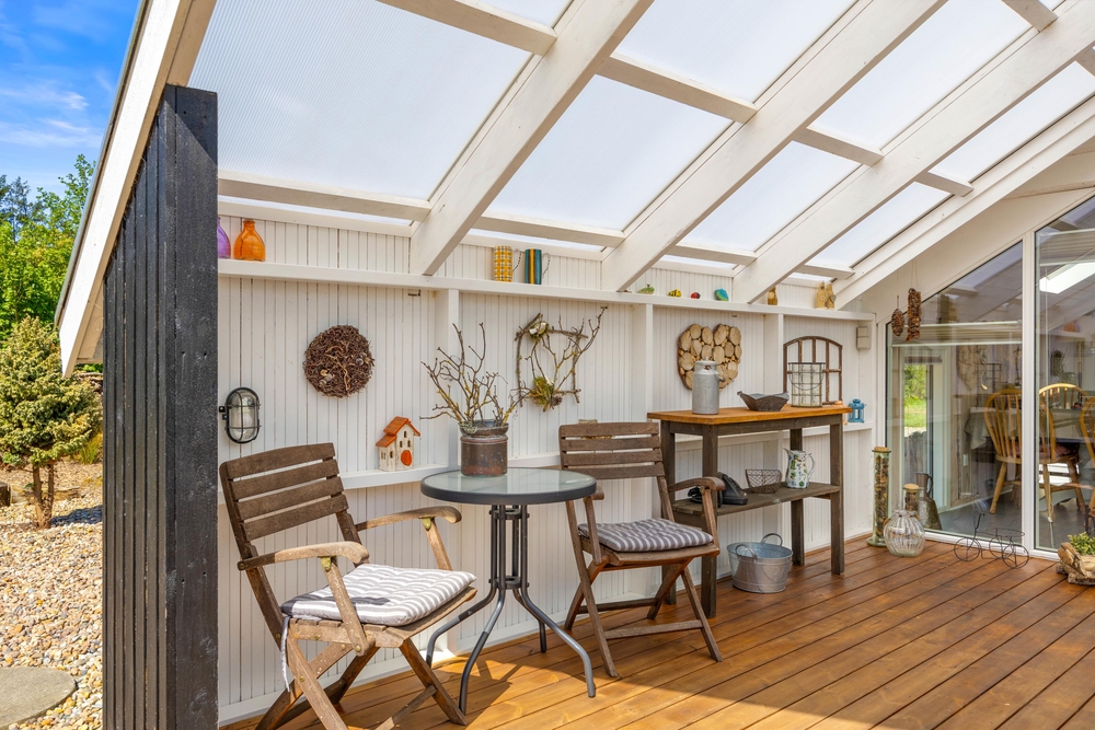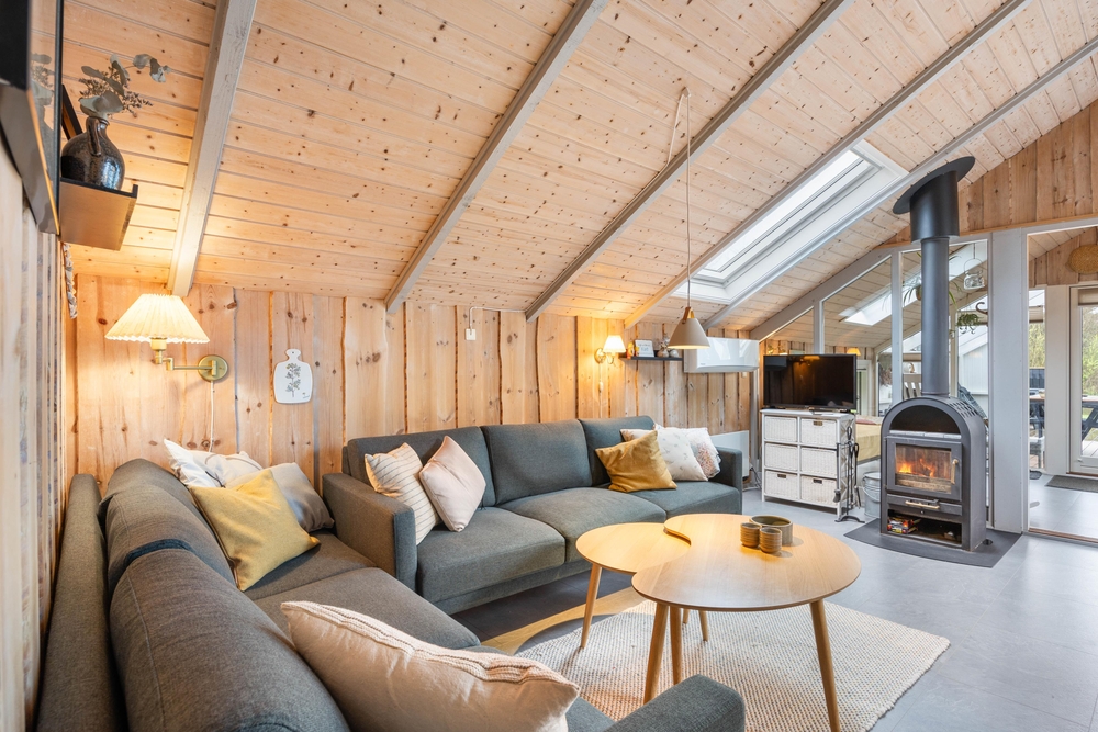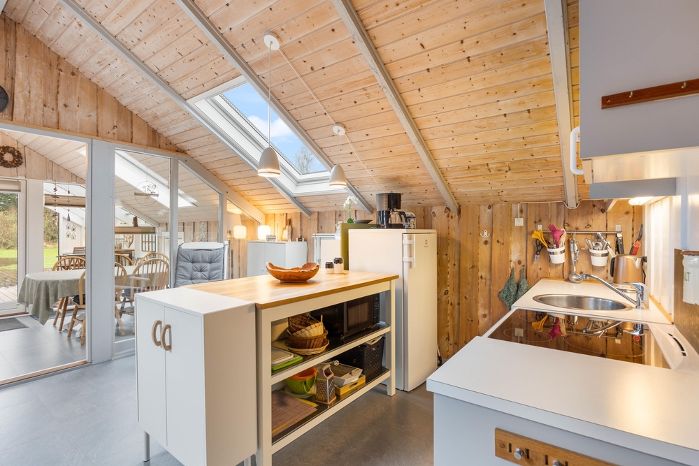 Das Wohnzimmer des Ferienhauses in Jegum Ferieland strahlt eine gemütliche und einladende Atmosphäre aus. Herzstück des Raumes ist der Kaminofen, der an kühleren Tagen für wohlige Wärme sorgt. Der Wintergarten des Ferienhauses im Blomstervangen 111 ist ein Highlight, das zu jeder Jahreszeit genutzt werden kann. Große Fensterfronten lassen viel natürliches Licht herein und schaffen eine helle, einladende Atmosphäre, die euch zum Verweilen einlädt.