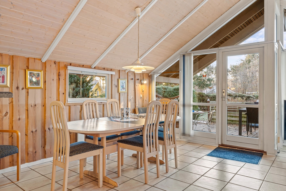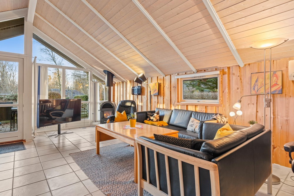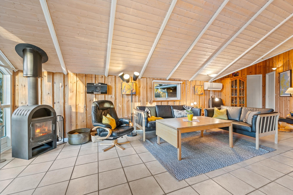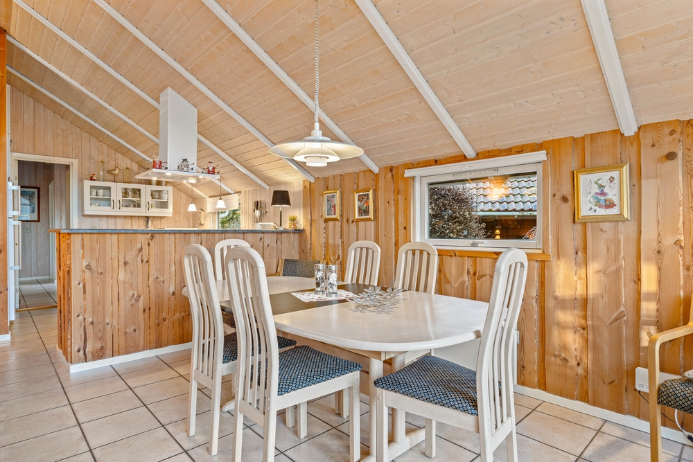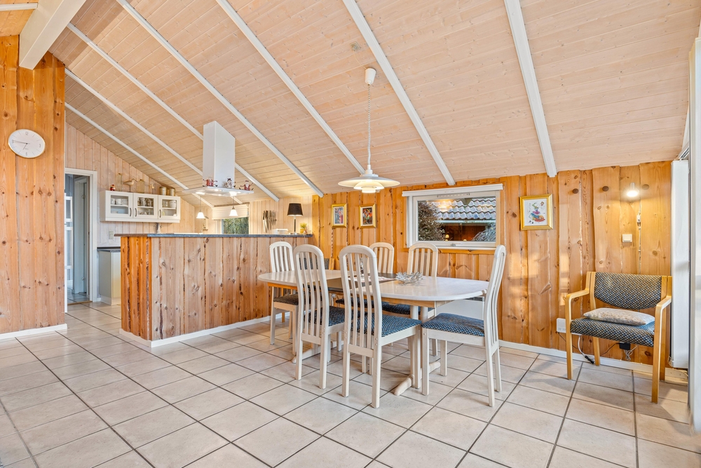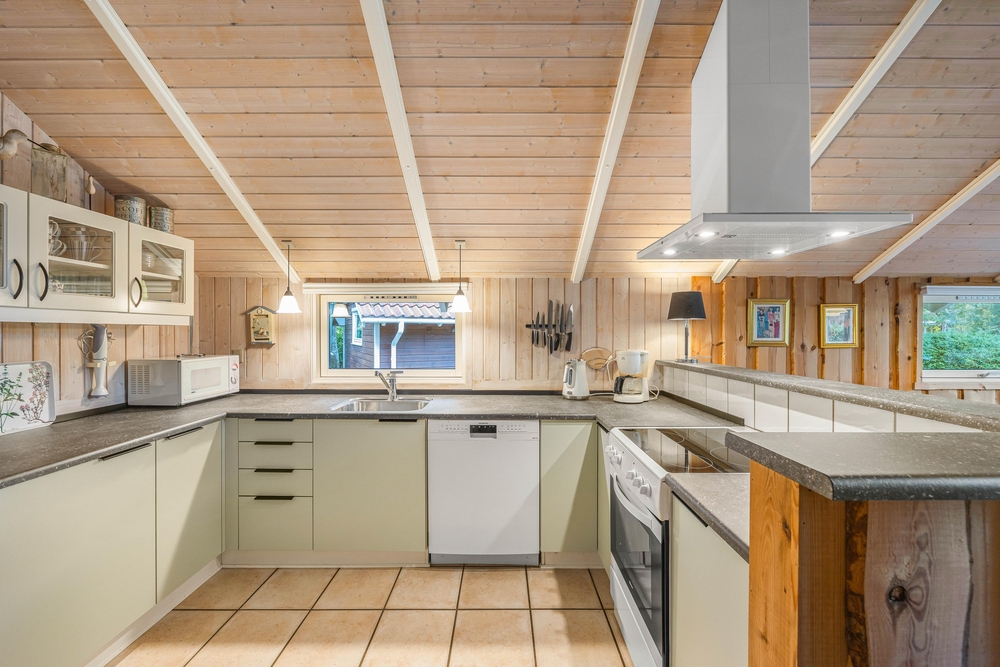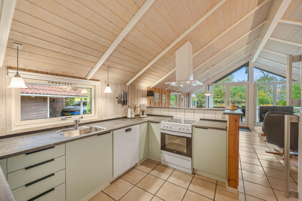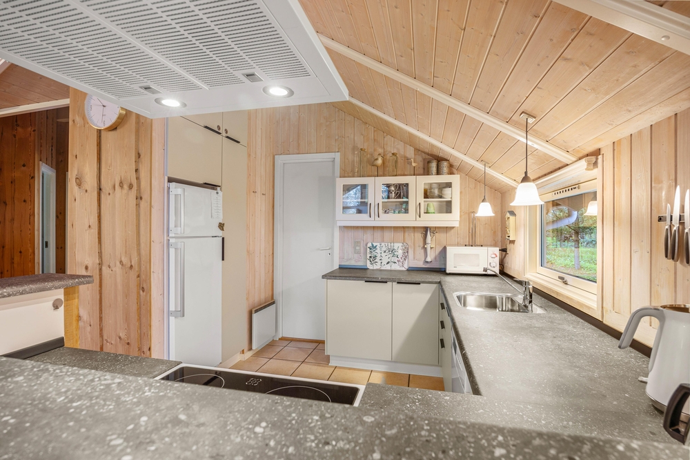 Das Ferienhaus im Blomstervangen 25 überzeugt durch seine offene Gestaltung, welches Wohnzimmer, Küche und Essbereich miteinander verbindet. Diese offene Gestaltung ermöglicht es euch von einem Bereich in den anderen zu wechseln, ohne auf Kommunikation und Zusammen sein zu verzichten. Der Kaminofen im Wohnzimmer sorgt für eine angenehme Wärme und behagliche Atmosphäre. Hier könnt ihr gemeinsam Spiele spielen, spannende Filme schauen oder einfach nur die Ruhe genießen. Der Essbereich fügt sich nahtlos ein und bietet ausreichend Platz für gemeinsame Mahlzeiten. Ob ein ausgedehntes Frühstück oder ein leichtes Mittagessen, hier finden alle ihren Platz. Die angrenzende Küche ist praktisch eingerichtet und bietet alles, was ihr für die Zubereitung köstlicher Gerichte benötigt. Die integrierte Spülmaschine erledigt anschließend den Abwasch für euch.