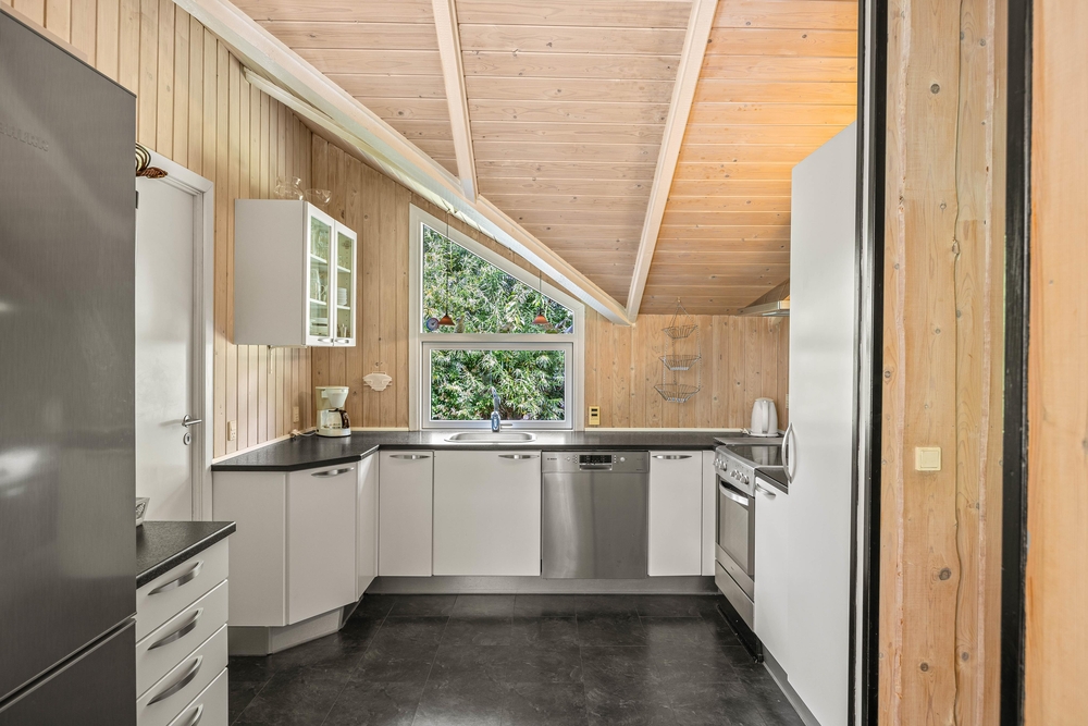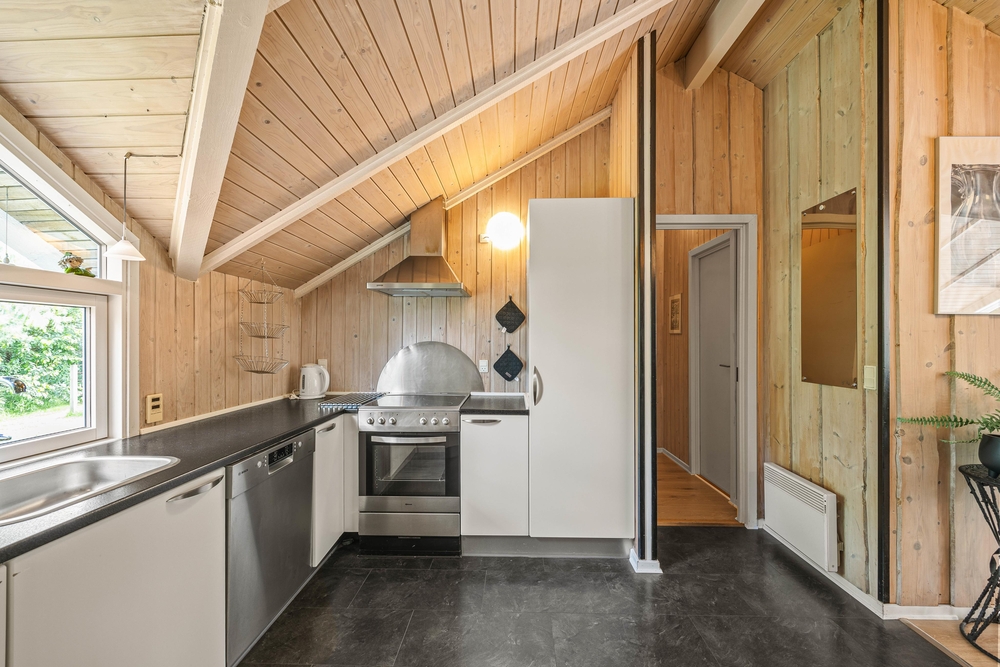 Verbringt entspannte Abende im Wohnzimmer, welcher mit einem Kaminofen ausgestattet ist, und genießt die wohlige Wärme, die der Kamin verbreitet. Große Fenster lassen viel Tageslicht herein und bieten einen schönen Blick auf den Garten. Voll ausgestattet mit allem notwendigen, darunter eine Spülmaschine, erleichtert die Küche des Ferienhauses im Blomstervangen 74 euch die Zubereitung köstlicher Mahlzeiten. Der offene Schnitt der Küche fördert eine gesellige Atmosphäre, in der gemeinsames Kochen Freunde bereitet. Der Essbereich, direkt angrenzend an der Küche, bietet ausreichend Platz, um zusammen zu speisen und gemütlich beisammenzusitzen.
