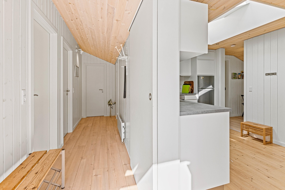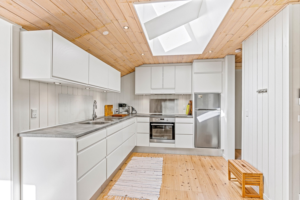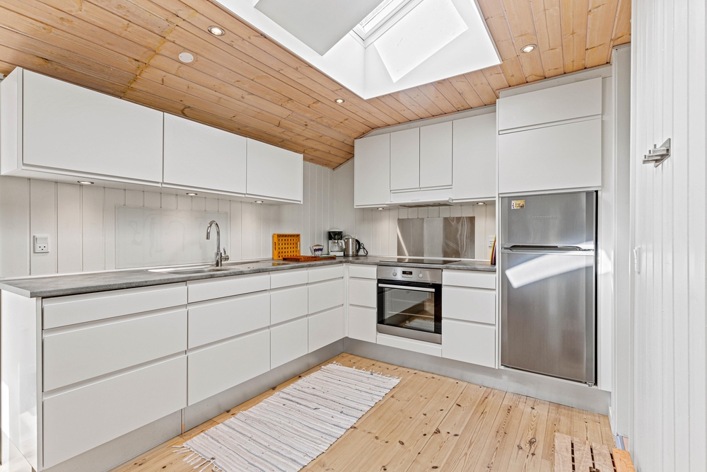 Der offene Wohnbereich mit Küche und Essplatz lädt zu gemeinsamen Stunden ein. Viel Holz, warme Farben und die vielen Sprossenfenster geben ein Wohngefühl, in dem man sich einfach nur wohlfühlen kann. In der neuen, modernen Küche macht das Kochen gleich noch mehr Spaß, und die Vorbereitungen für das Abendessen könnten zum Familienevent werden. Packt ein paar Gesellschaftsspiele ein, und macht einen lustigen Spieleabend, während im Kaminofen das Feuer brennt.