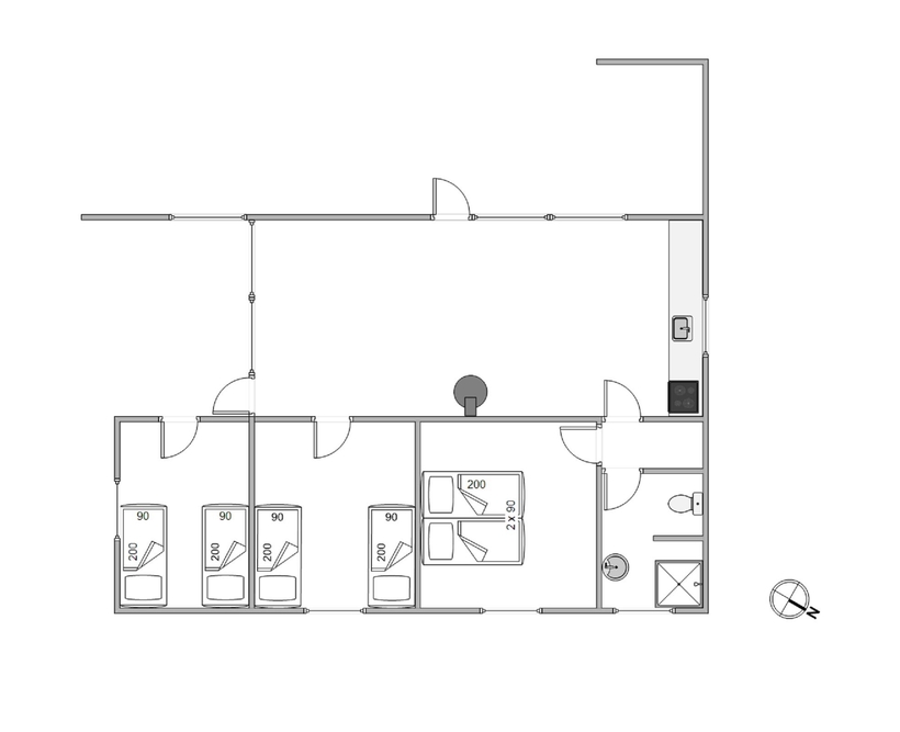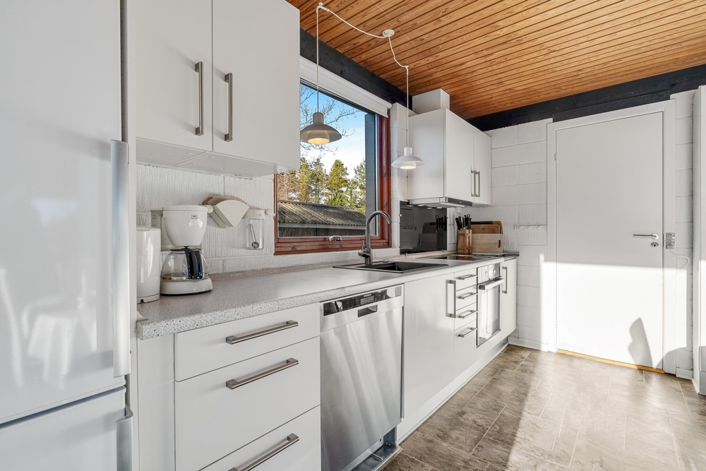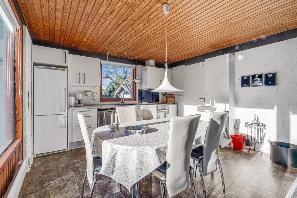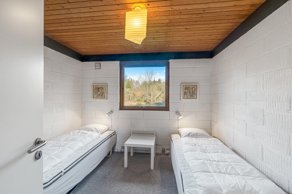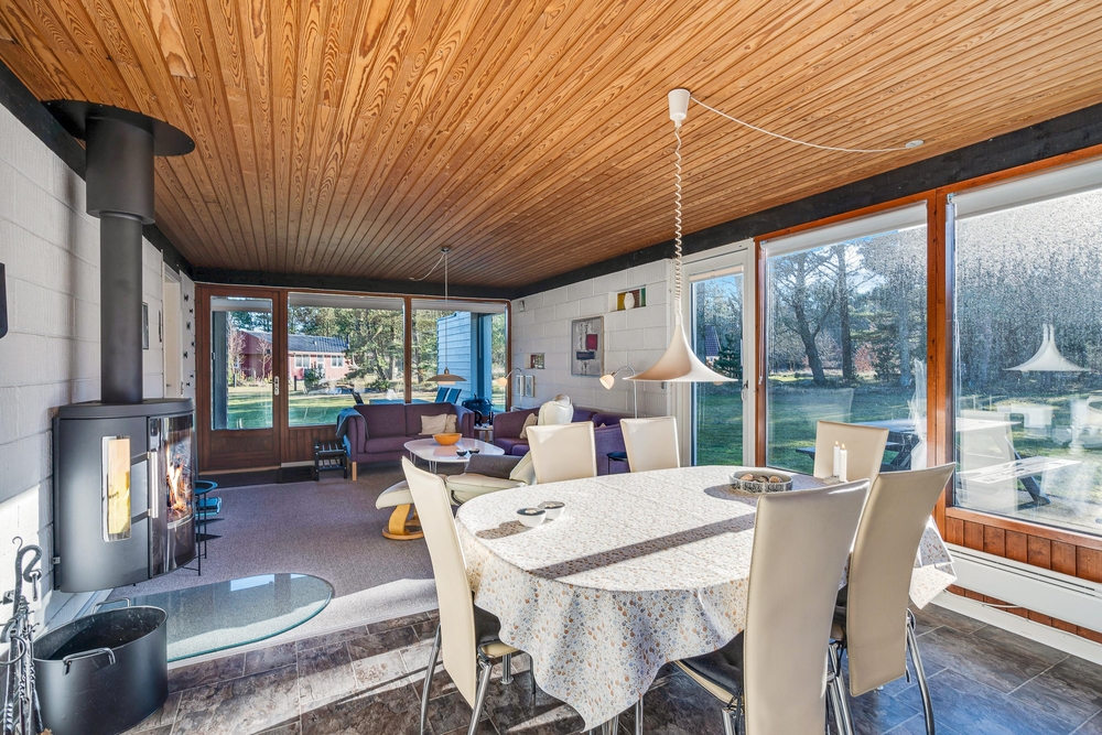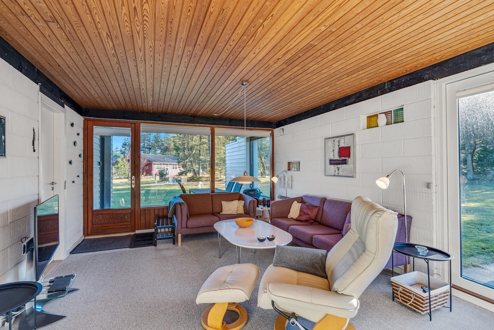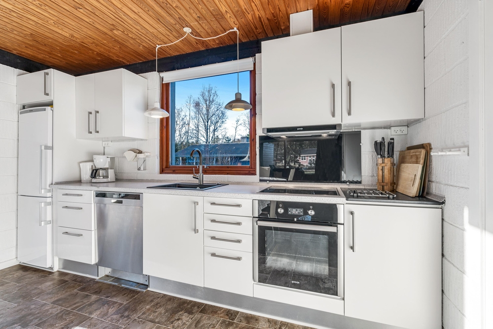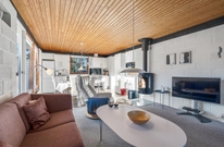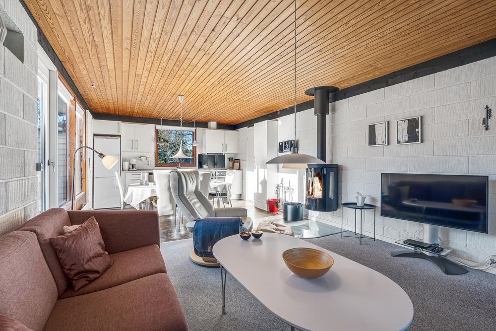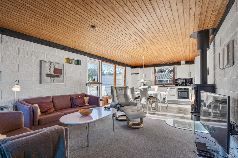 Das typisch dänische Sommerhaus bietet euch einen Wohnbereich mit Kamin, in welchen die offene Küche sowie der Essbereich integriert sind. Darüber