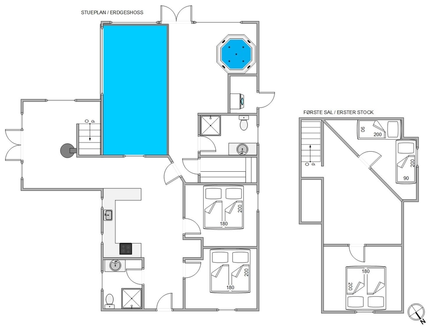 Im Poolraum erwartet euch ein 18 Quadratmeter großer Swimmingpool, der stundenlangen Spaß für die Wasserratten der Familie bietet. Hier kann man tauchen, Ball spielen oder gegen den Strom schwimmen, den die Gegenstromanlage vorgibt. Hier findet ihr auch die Sauna, in der ihr ausgiebige Saunagänge genießen könnt und den Whirlpool für Entspannungsbäder.
