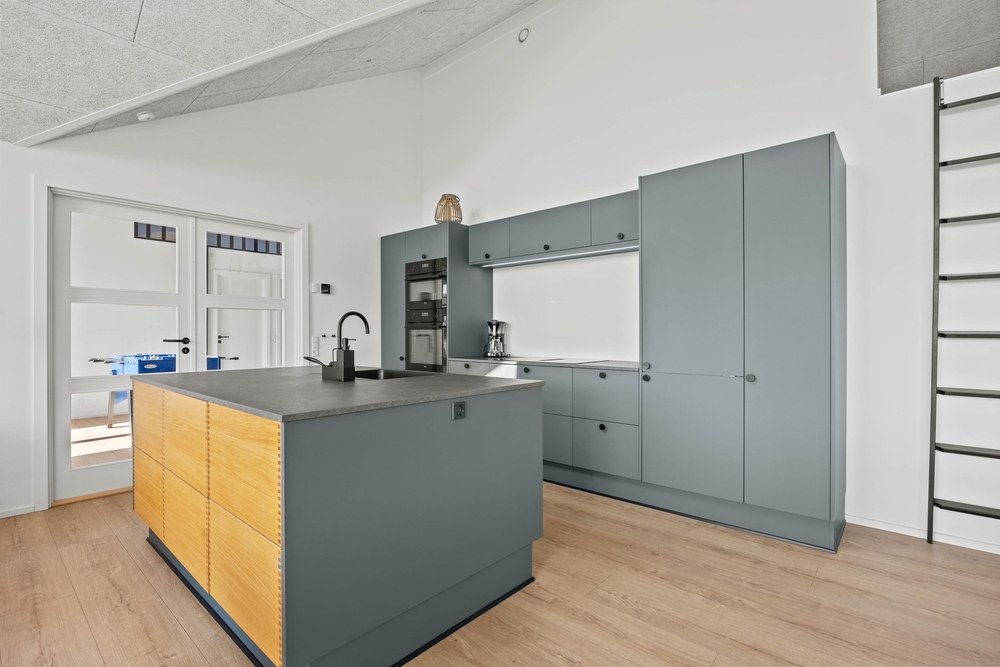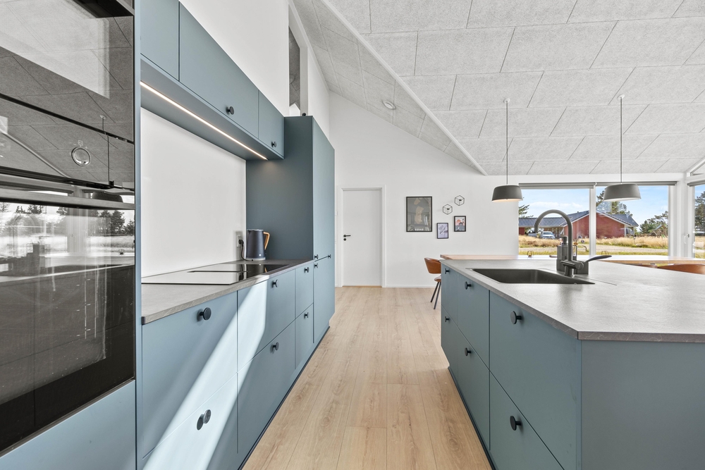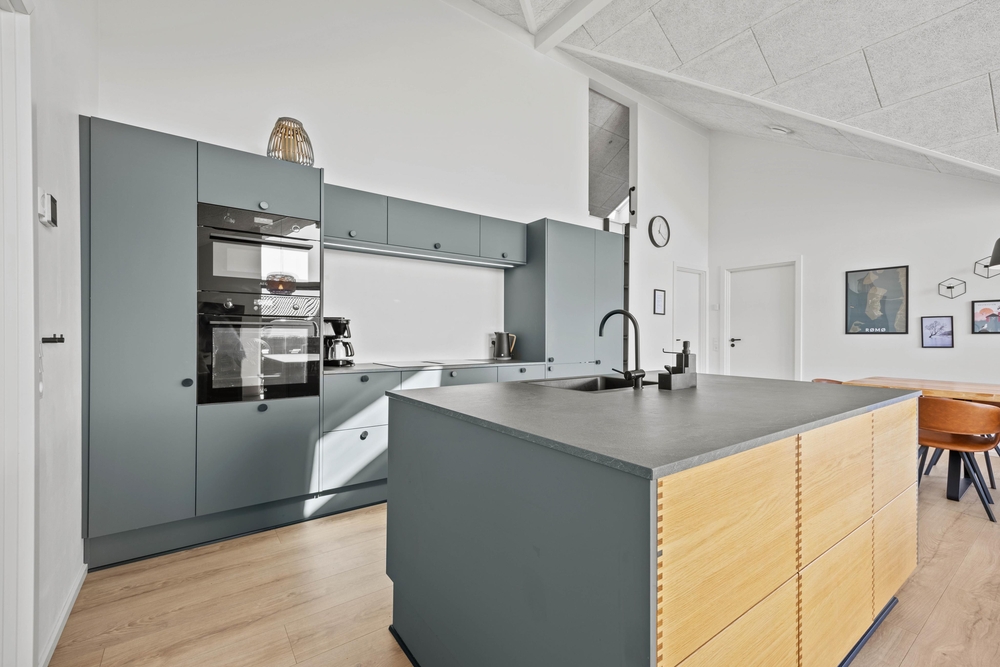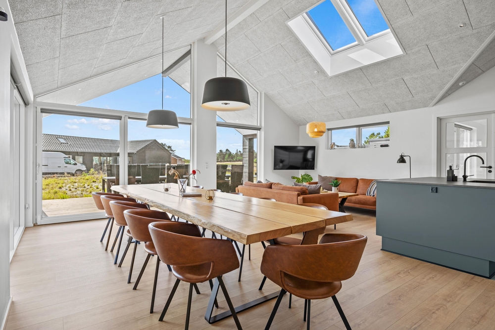 Der Mittelpunkt des Hauses ist die schicke Küche mit Geschirrspüler, die in offener Verbindung mit dem Esstisch und dem Wohnraum liegt. Für eine tolle Atmosphäre sorgen hier die Decke bis zum Giebel und die große Fensterfront in Richtung Wattenmeer. Frühaufsteher können hier atemberaubende Sonnenaufgänge bewundern.