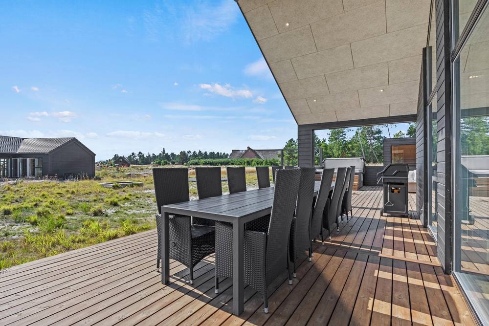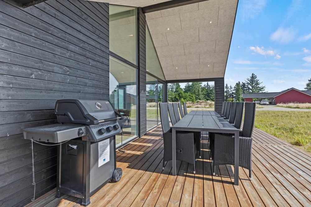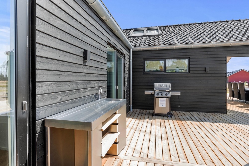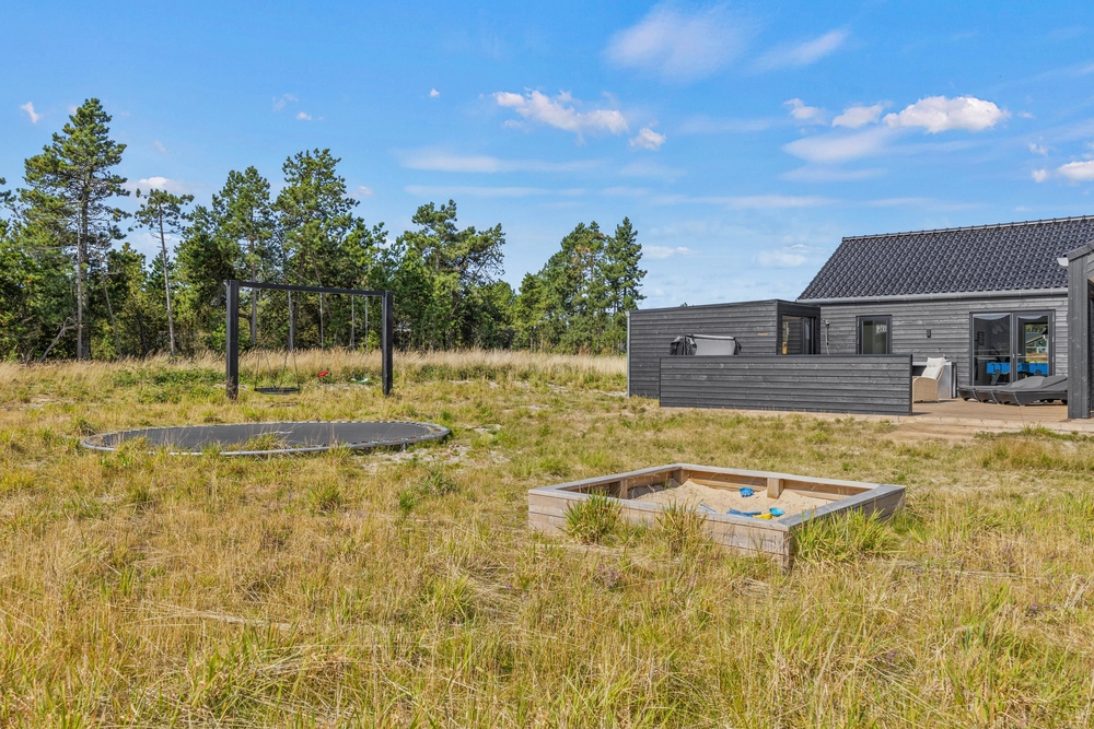Die großzügig angelegte Holzterrasse lädt zu stundenlangen Aufenthalten im Freien ein ? hier gibt es schöne Gartenmöbel, wo man den Blick auf das Wattenmeer so richtig genießen kann. Während die Eltern bei einem Glas Wein und Köstlichkeiten vom Gasgrill chillen, können sich die Kleineren auf dem kinderfreundlichen Grundstück mit Trampolin, Sandkasten und Schaukel amüsieren.
