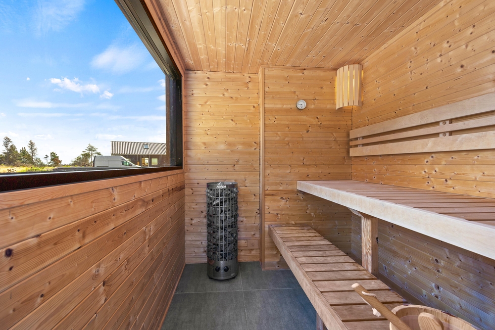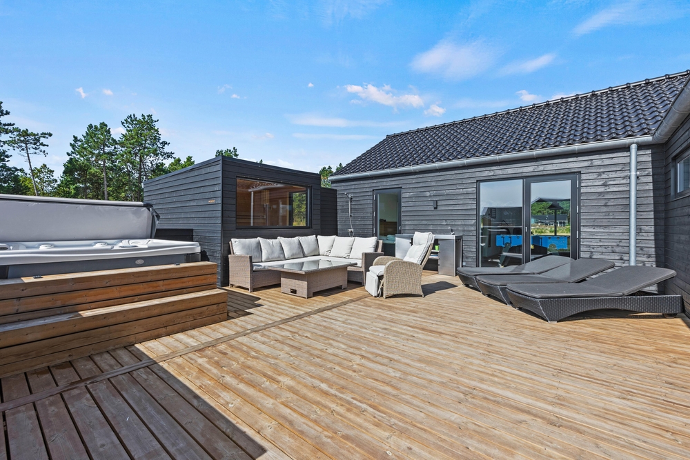 Für Entspannung und Wellness stehen eine Saunahütte und ein großer Außenwhirlpool auf der Terrasse zur Verfügung. Nach dem Saunagang kann man sich unter der Außendusche abspülen, welche von April bis November in Betrieb ist.