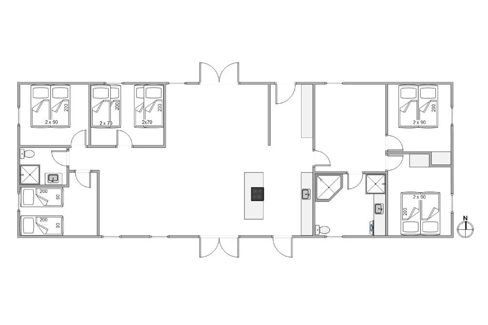 Wenn ihr eine kleine Pause vom Familientrubel benötigt, dann könnt ihr euch in eines der 5 Schlafzimmer zurückziehen. Die Schlafzimmer sind mit jeweils 3 Doppelbetten, 2 Einzelbetten und 2 Etagenbetten ausgestattet und laden zum Träumen ein. Es gibt 2 Badezimmer im Ferienhaus, welche mit einer Fußbodenheizung beheizt werden. In einem Badezimmer befindet sich eine Kombimaschine aus Waschmaschine und Trockner.