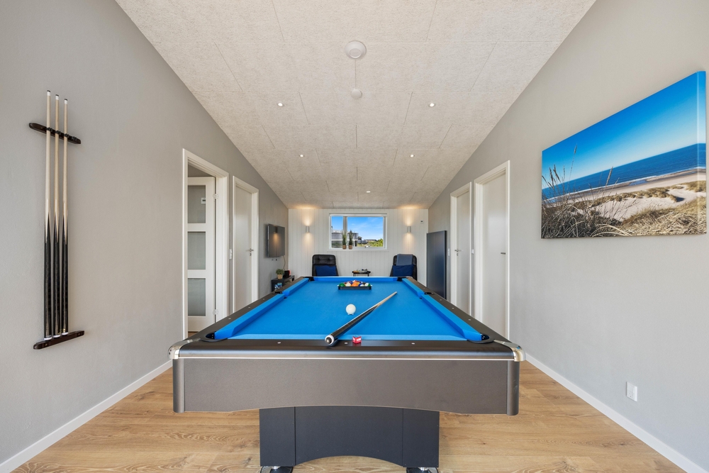 Im freundlich gestalteten Wohnbereich mit schönem Holzfußboden, erwartet euch ein gemütlicher Sitzbereich mit einem tollen Kamin. Hier lässt es sich herrlich mit einem guten Buch oder bei einem gemeinsamen Fernsehabend Entspannen. Es gibt 3 deutsche Kanäle in diesem Ferienhaus. Für mehr Aktion könnt ihr euch am Poolbillard üben oder Tischtennis spielen.