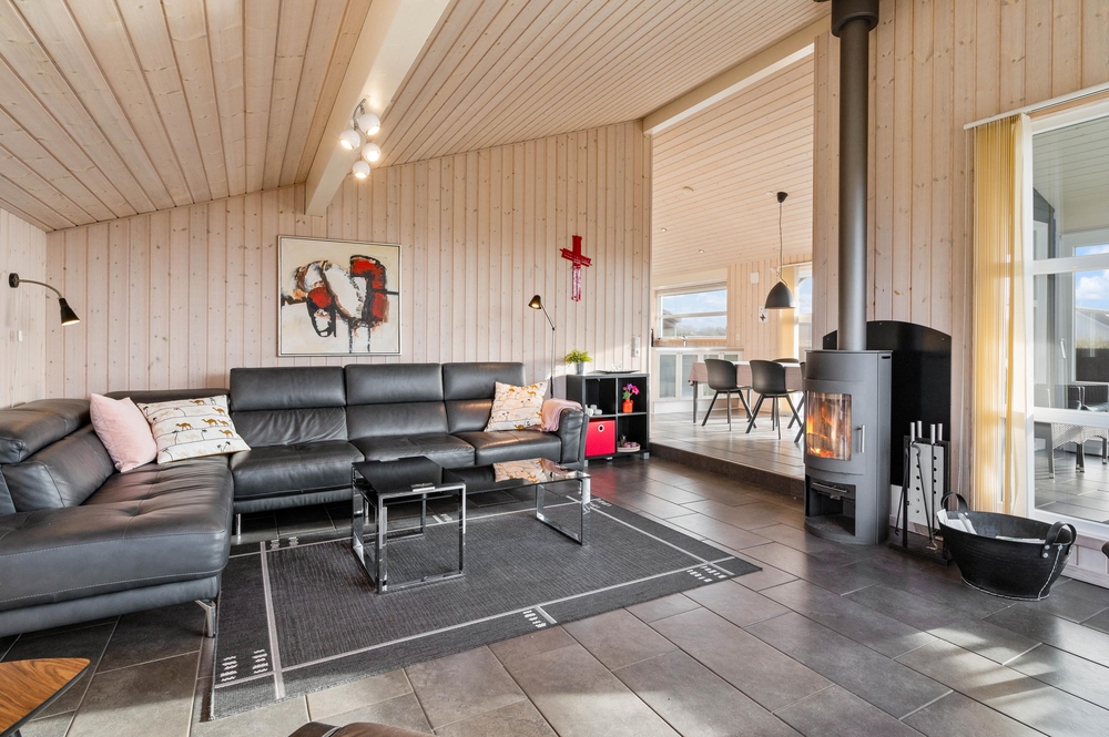 Dieses geschmackvoll eingerichtete Ferienhaus bietet Entspannung und Wellness für den anspruchsvollen Gast. Die große und helle Küche des Sommerhauses hat eine offene Verbindung zum Essbereich, der wiederum eine offene Verbindung zum gemütlichen Wohnbereich mit eleganten Ledermöbeln und einem Holzofen hat. In allen Räumen besticht das traumhaft einladende Licht, das die Möbel und die wunderschönen Fliesenböden erst richtig zur Geltung bringt.
