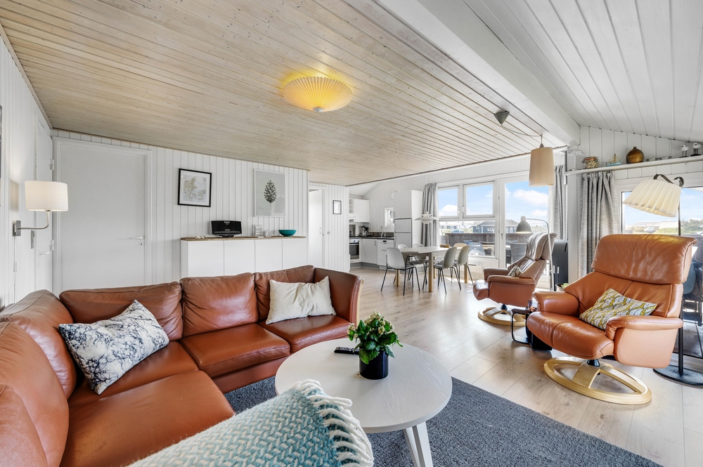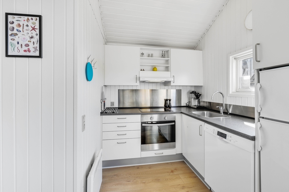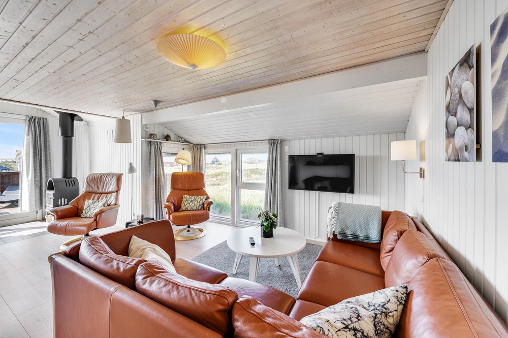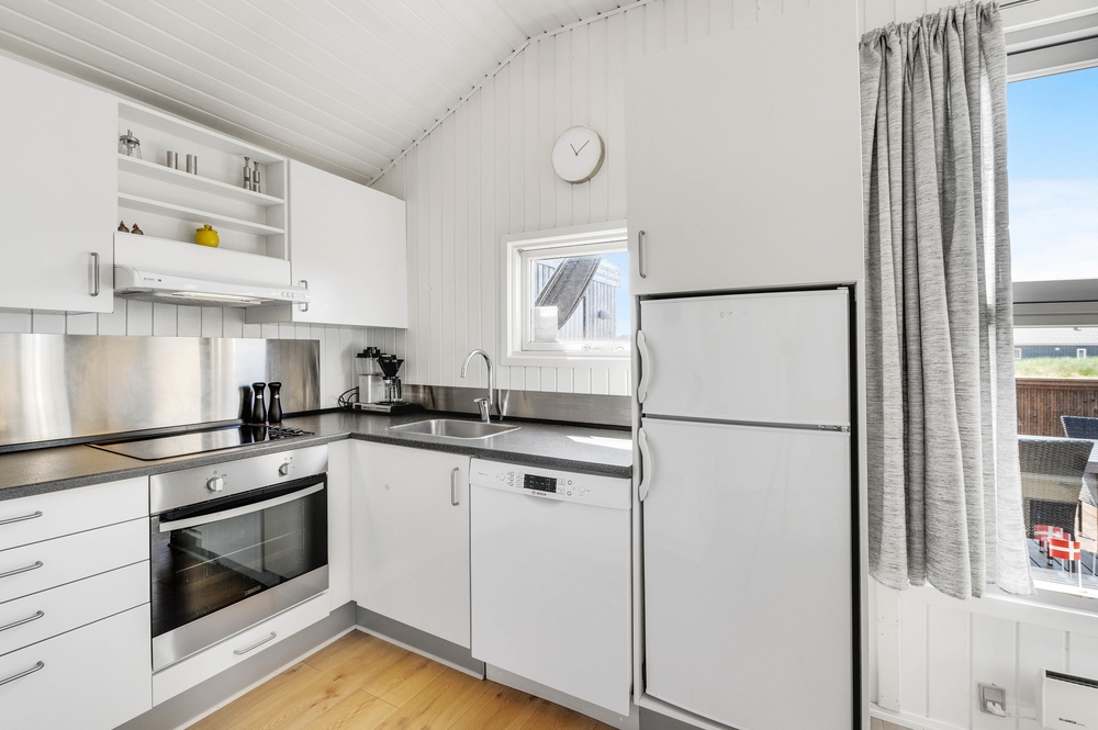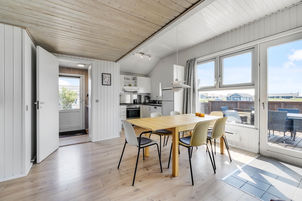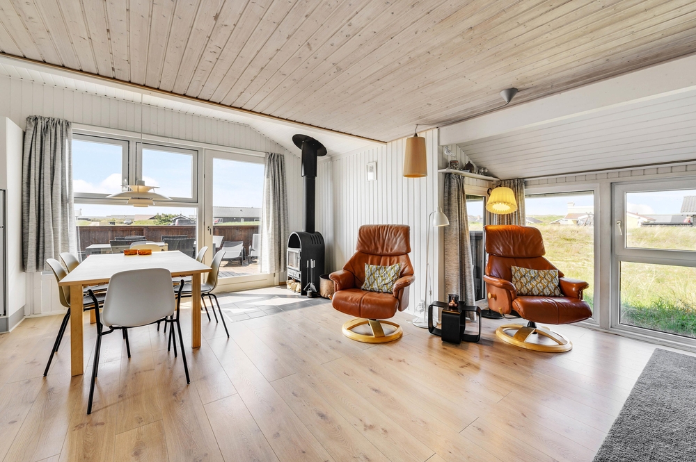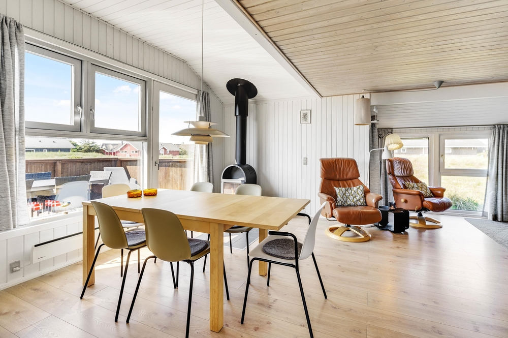 Macht es euch in den beiden Sesseln am wärmenden Kamin bequem und genießt die Aussicht über die Dünenlandschaft eures Ferienortes Bjerregård. Eine offene und freundlich gestaltete Küche sorgt für ausreichend Platz zum Ausprobieren neuer Rezepte. Direkt neben der Küche findet ihr einen großen Esstisch an der Fensterfront des Ferienhauses, wo ihr leckere Abendessen bei einem kühlen Glas Wein genießen könnt.