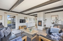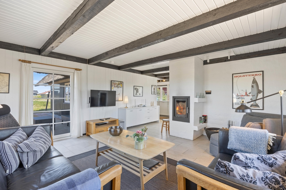 Die hellen Böden, Wände und Decken und das natürliche Licht, schaffen eine schöne Atmosphäre im Wohnbereich. Hier könnt ihr es euch mit einem guten Buch vor dem Kaminofen gemütlich machen oder gemeinsam einen Film schauen. Auch mit der energiesparenden Wärmepumpe könnt ihr das Ferienhaus schnell auf eure Wohlfühltemperatur bringen.
