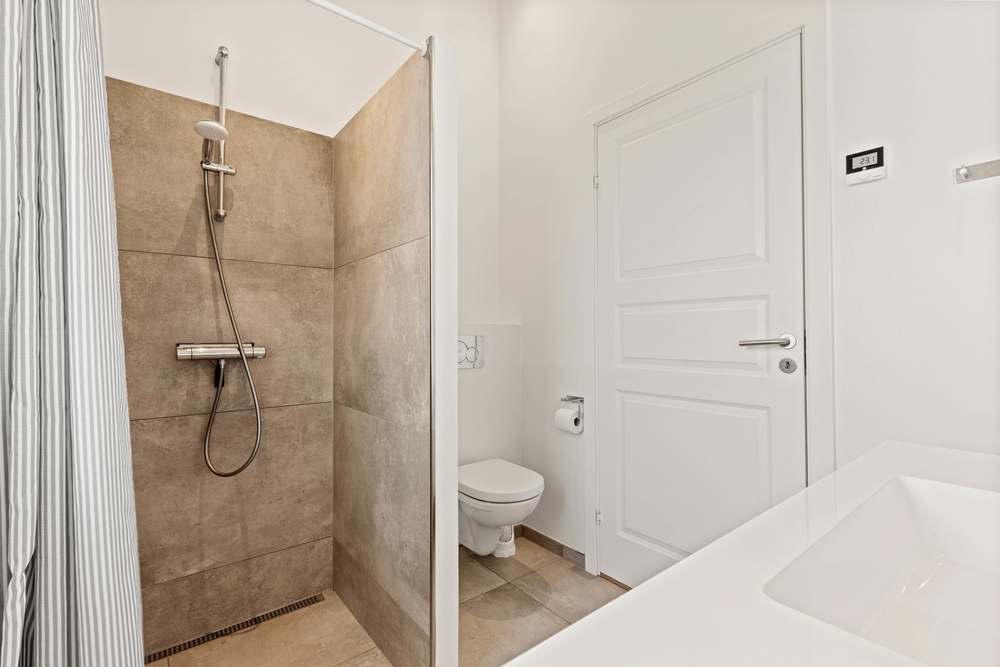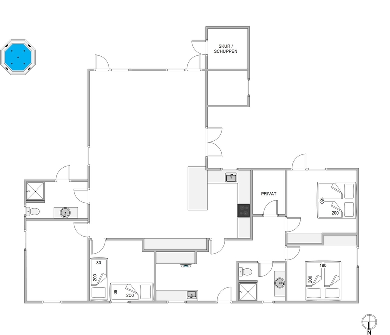 Der Grundriss bietet außerdem 2 moderne Bäder und einen großen Eingangsbereich, in dem auch die Waschmaschine und der Trockner untergebracht wurden. Das ganze Ferienhaus ist mit praktischem Fliesenboden und einer Fußbodenheizung ausgestattet, die mit einer energiesparenden Wärmepumpe betrieben wird.