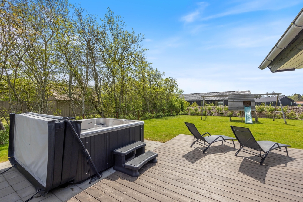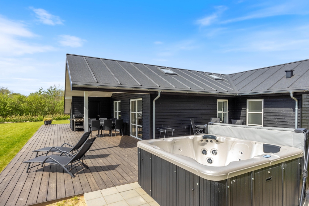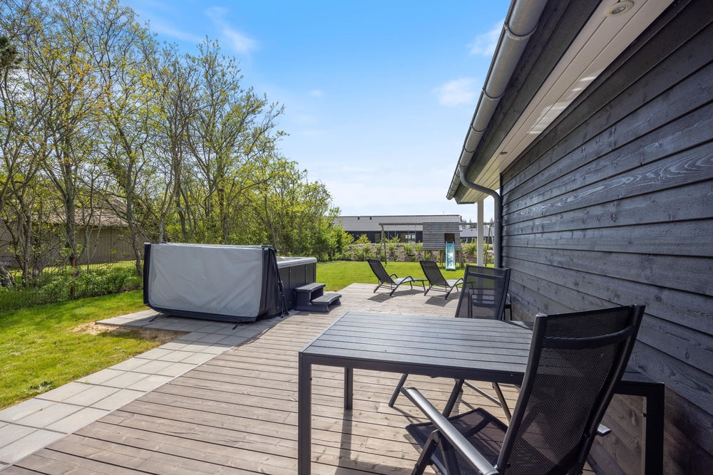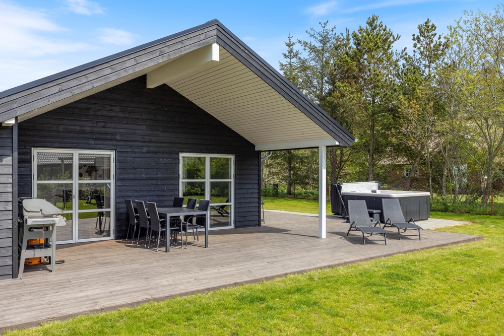 An der Südseite des Hauses befindet sich eine schöne große Holzterrasse mit bequemen Gartenmöbeln, auf denen ihr im Schatten unter dem Vordach sitzen oder das Abendessen vom Gasgrill genießen könnt. Später am Abend bietet sich der Außenwhirlpool zum Aufwärmen und Entspannen an. Ein Ort zum wohl fühlen und um die Seele baumeln zu lassen.